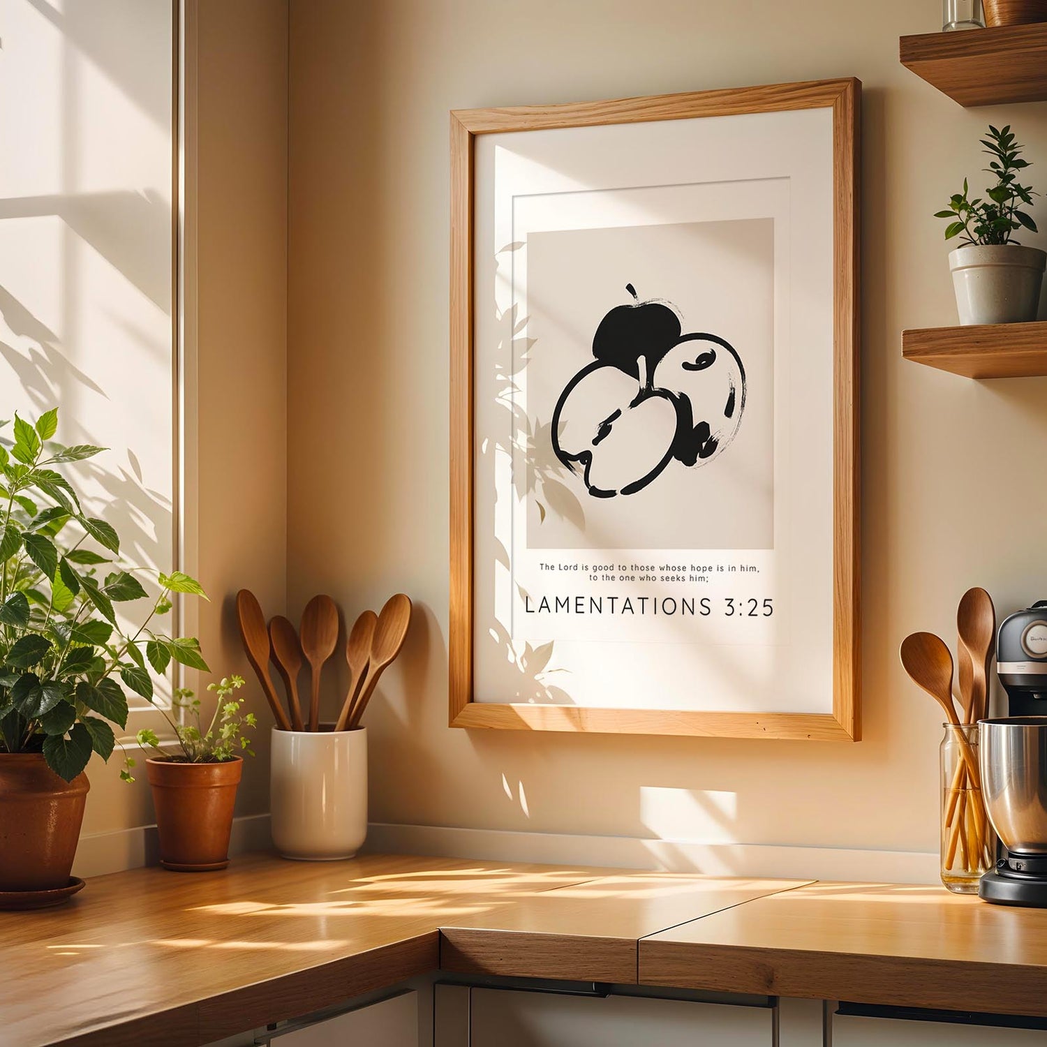 The Lord is Good Modern Christian Wall Art Print - Introducing a beautifully designed Bible verse print featuring the comforting words from Lamentations 3:25 - 'The Lord Is Good To Those Whose Hope Is In Him.' This elegantly crafted piece presents the verse within a striking line drawing of apples set against a neutral beige background.