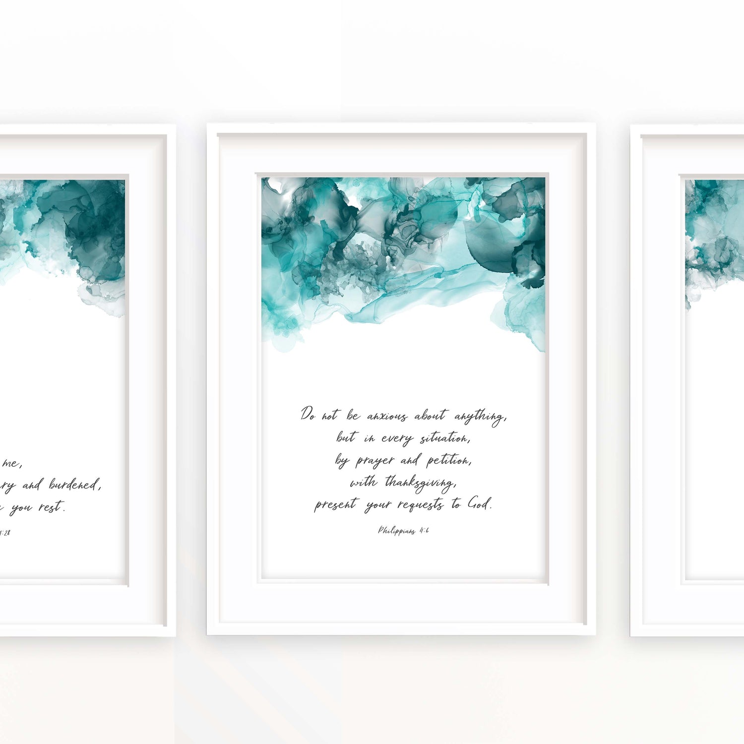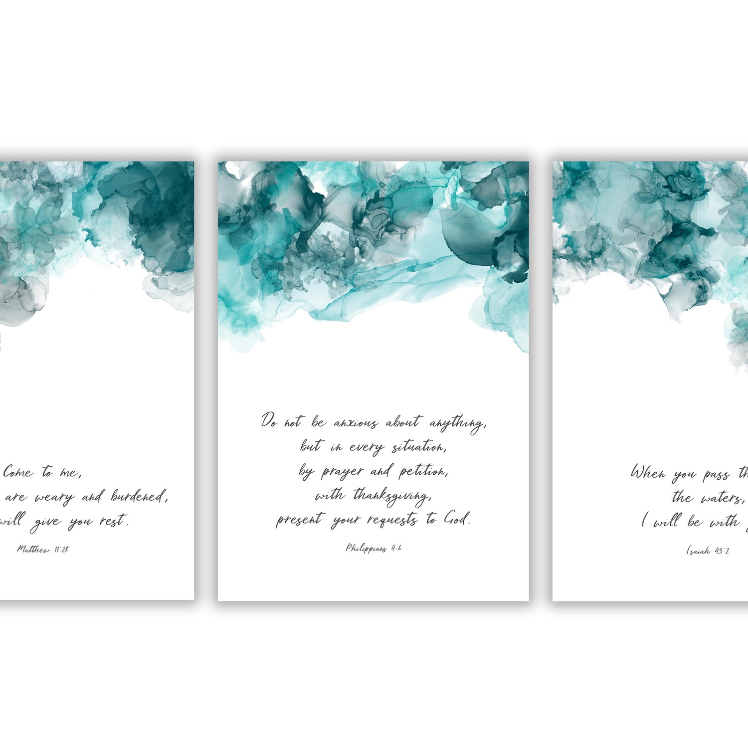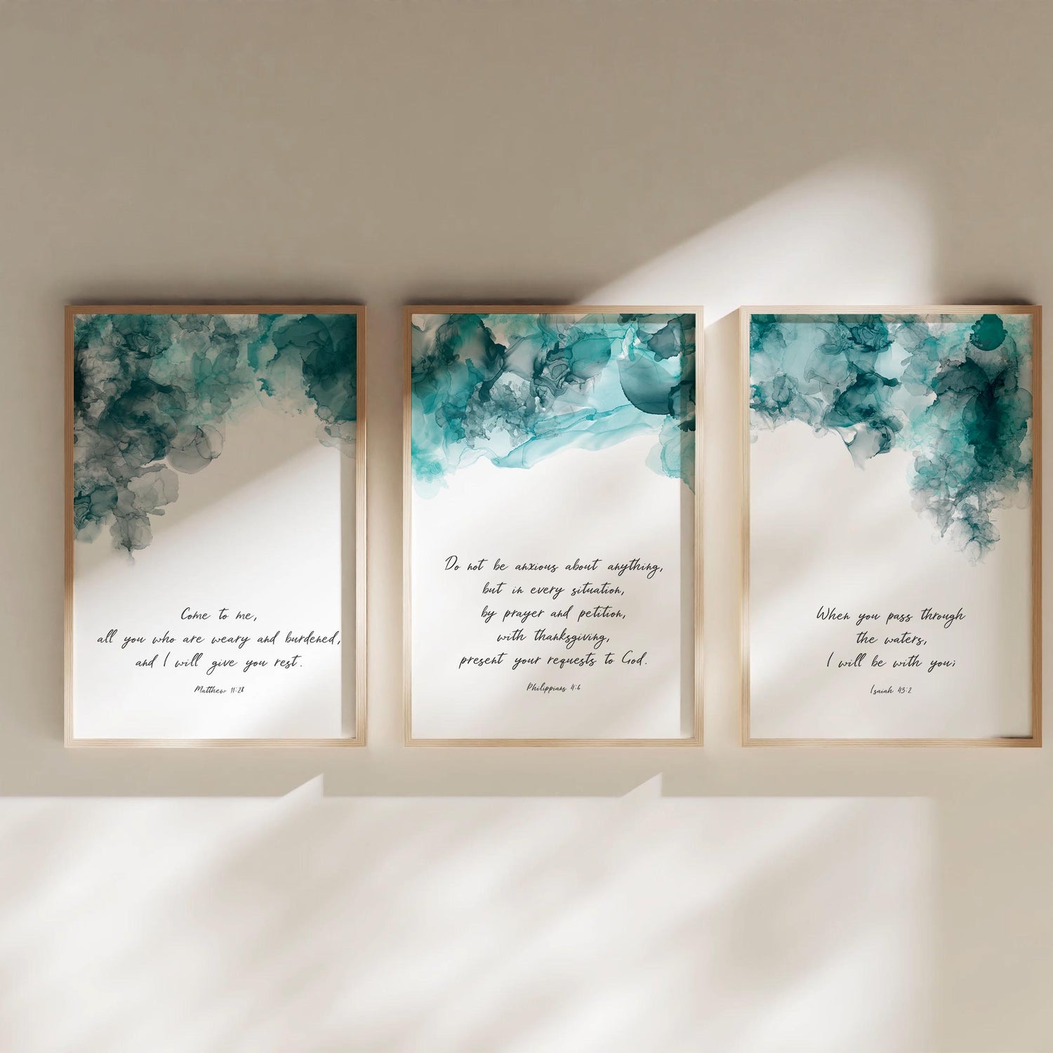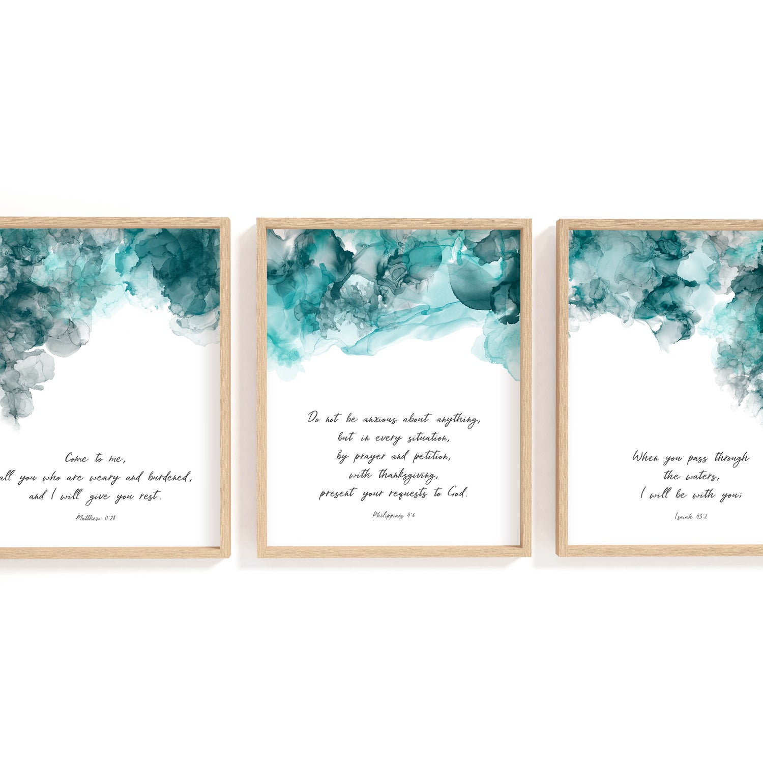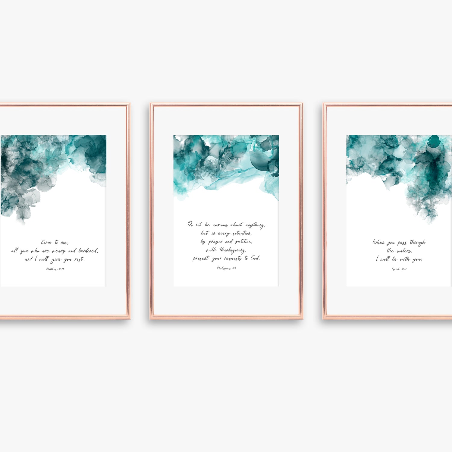 Comforting Christian Wall Art 3 Print Set - Bring calm, beauty and faith into your home with this Comforting Christian Wall Art 3 Print Set. Each piece features a captivating blend of turquoise and black ink, creating a striking abstract design that feels both modern and deeply peaceful. The collection includes three powerful Bible verses to inspire, comfort and uplift your heart every day.