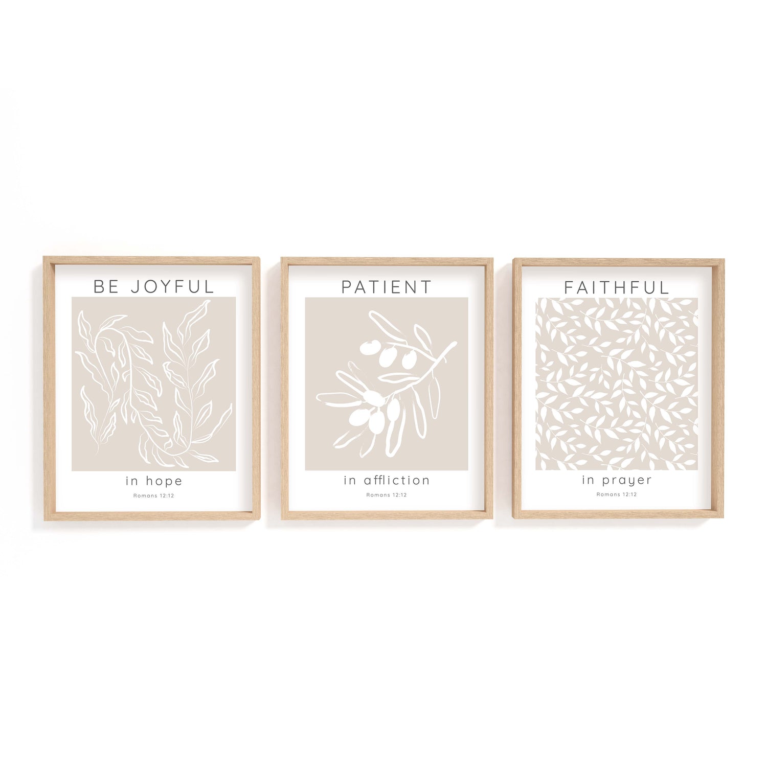 Be Joyful in Hope Christian Wall Art 3 Print Set - A thoughtfully designed Bible Verse Print Set, a trilogy of inspiration capturing the essence of Romans 12:12. This neutral style set features a sophisticated beige background adorned with delicate white botanicals, creating an elegant and harmonious visual narrative.
