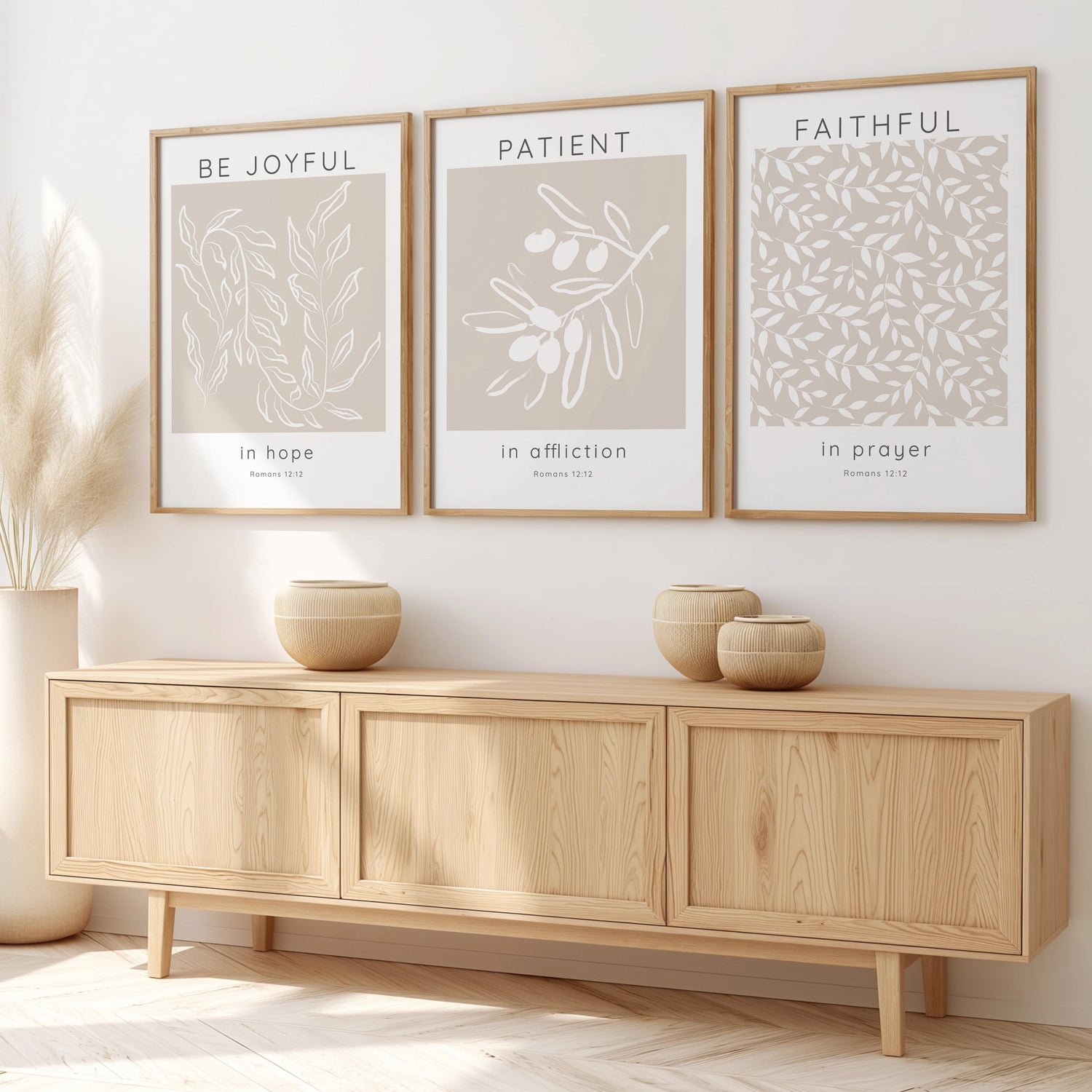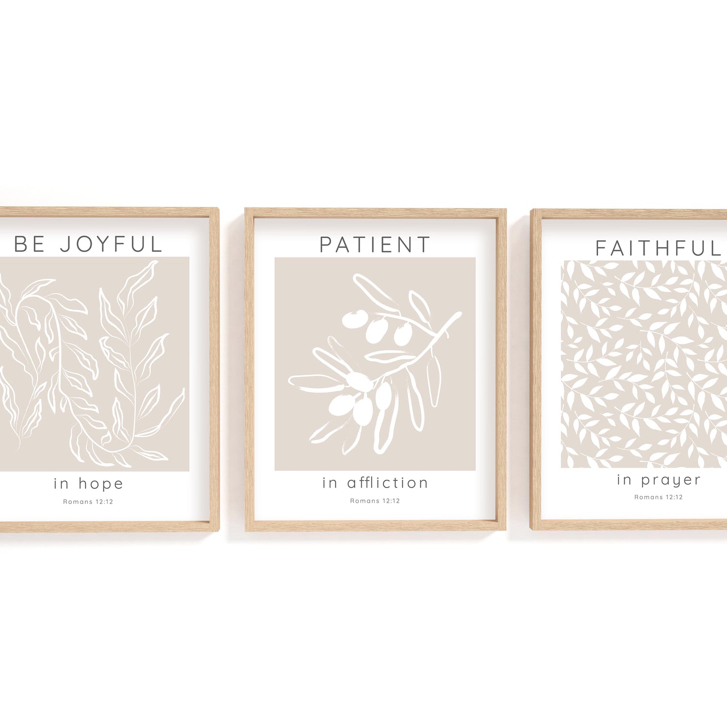 Transform your space into a haven of positivity and resilience with our Bible Verse Print Set – a beautifully designed trilogy available in various sizes, allowing you to immerse yourself in the timeless messages of Romans 12:12.