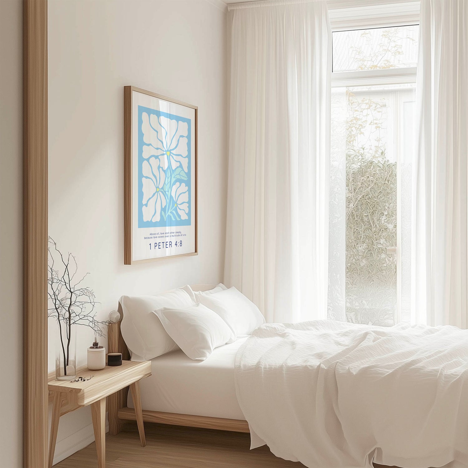 1 Peter 4:8 Bible Verse Print -Introducing our uniquely designed Bible Verse Print, featuring a Matisse-inspired bouquet of flowers set against a calming light blue backdrop. This exquisite piece showcases the verse from 1 Peter 4:8, encouraging us to "Above all, love each other deeply, because love covers over a multitude of sins."