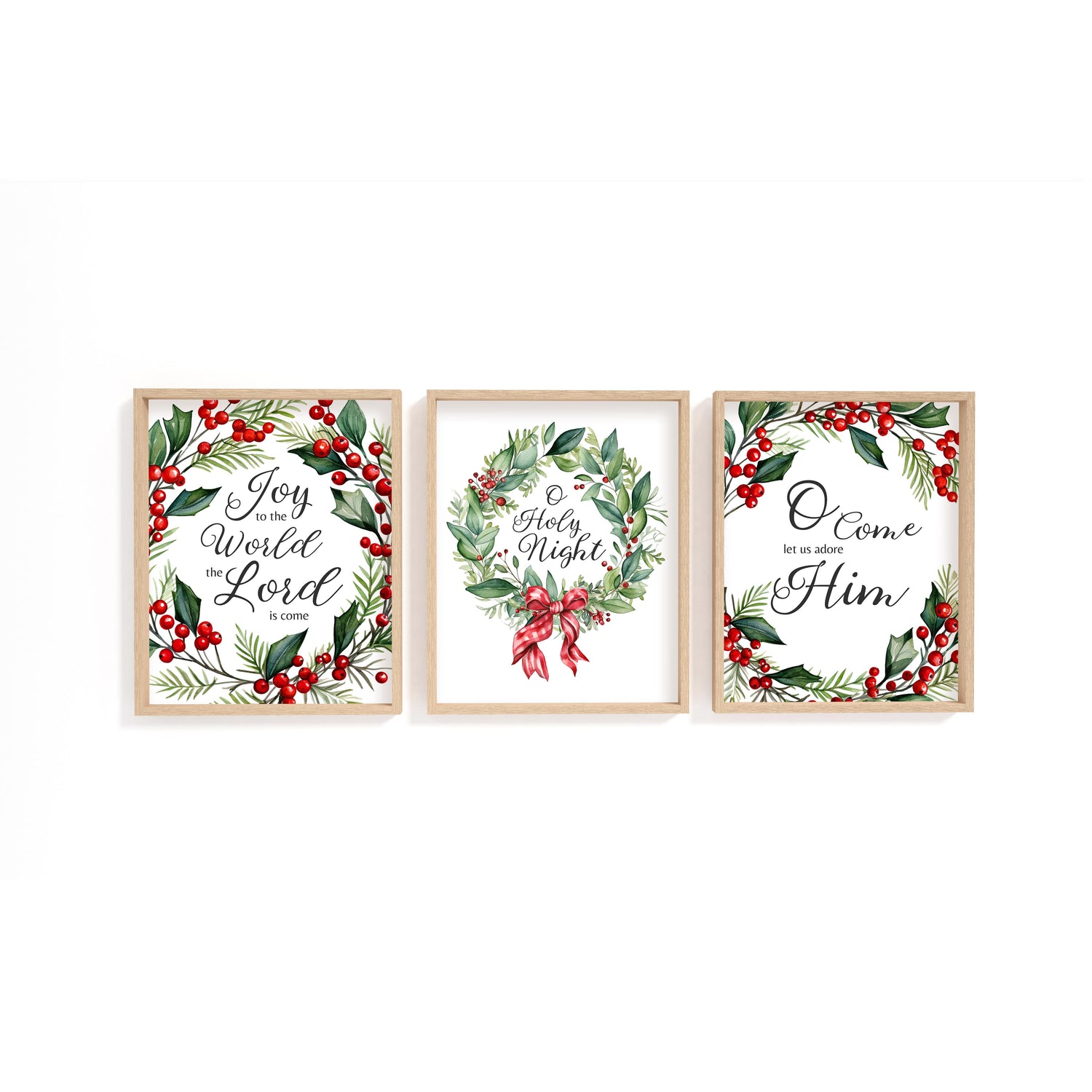 Christmas Carol Wreath 3 Print Set - Celebrate the season with a beautifully designed Christmas carol wreath print set. This 3-print set features cherished lines from classic carols: 'Joy to the World the Lord is come,' 'O Holy Night,' and 'O Come let us adore Him,' each surrounded by delicate wreaths of holly and berries in festive shades of green and red. Handcrafted to evoke the warmth and joy of the holidays, this set makes a perfect addition to your traditional Christmas decor.