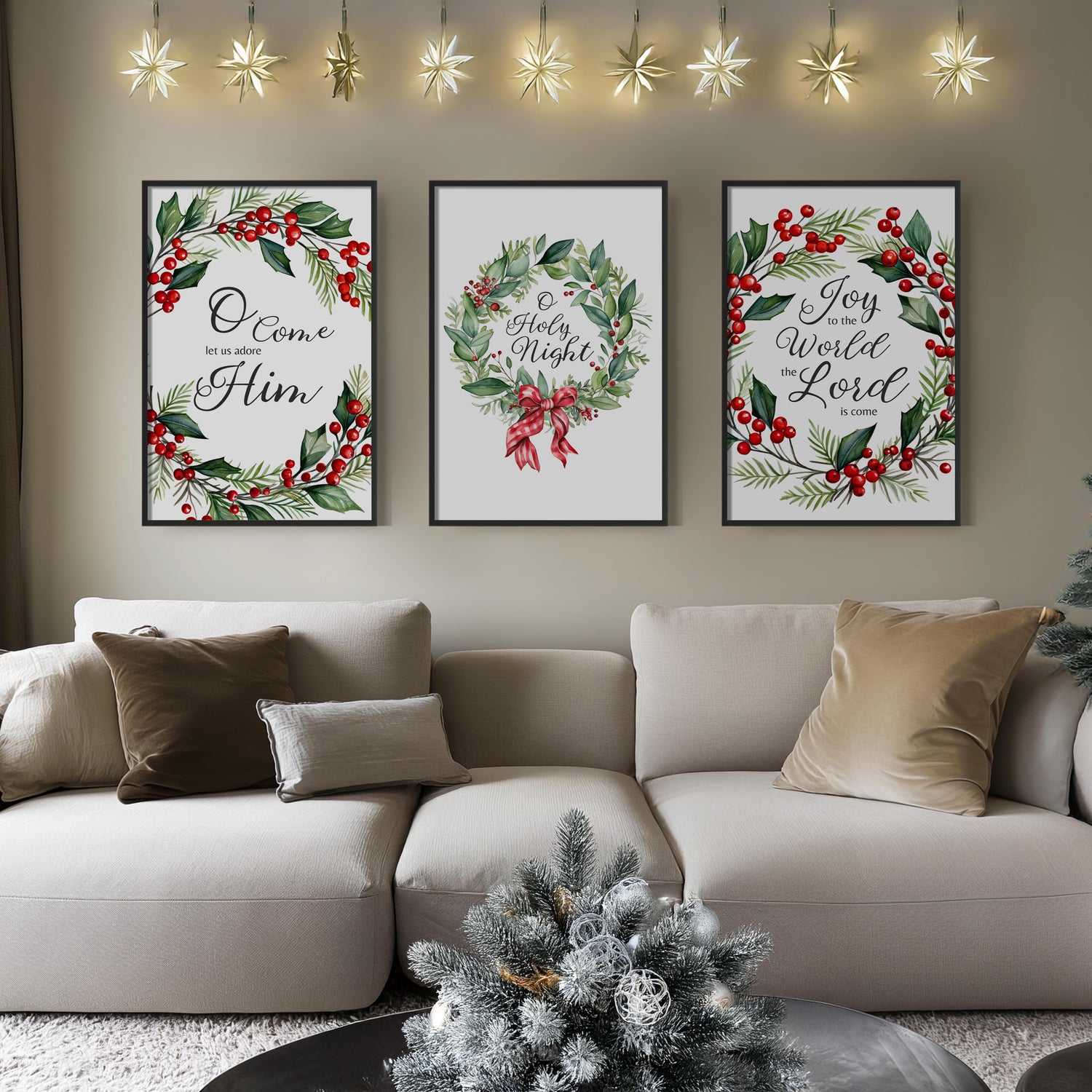 Christmas Carol Wreath 3 Print Set - Celebrate the heart of Christmas with this beautifully designed Christmas Carol Wreath 3 Print Set. Each print features a beloved line from classic carols — “Joy to the World the Lord is come” “O Holy Night” and “O Come let us adore Him” — framed by delicate wreaths of holly and berries in rich festive hues of red and green.