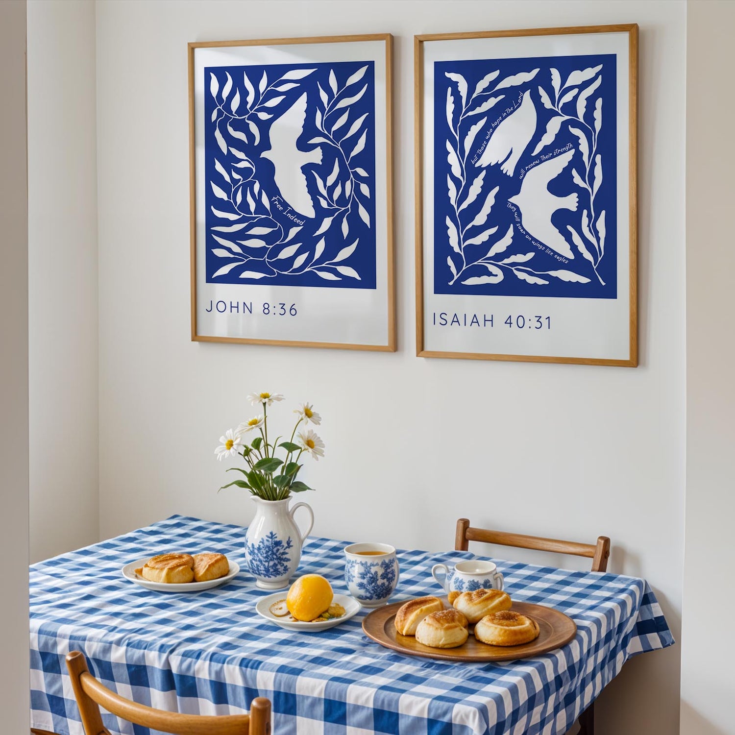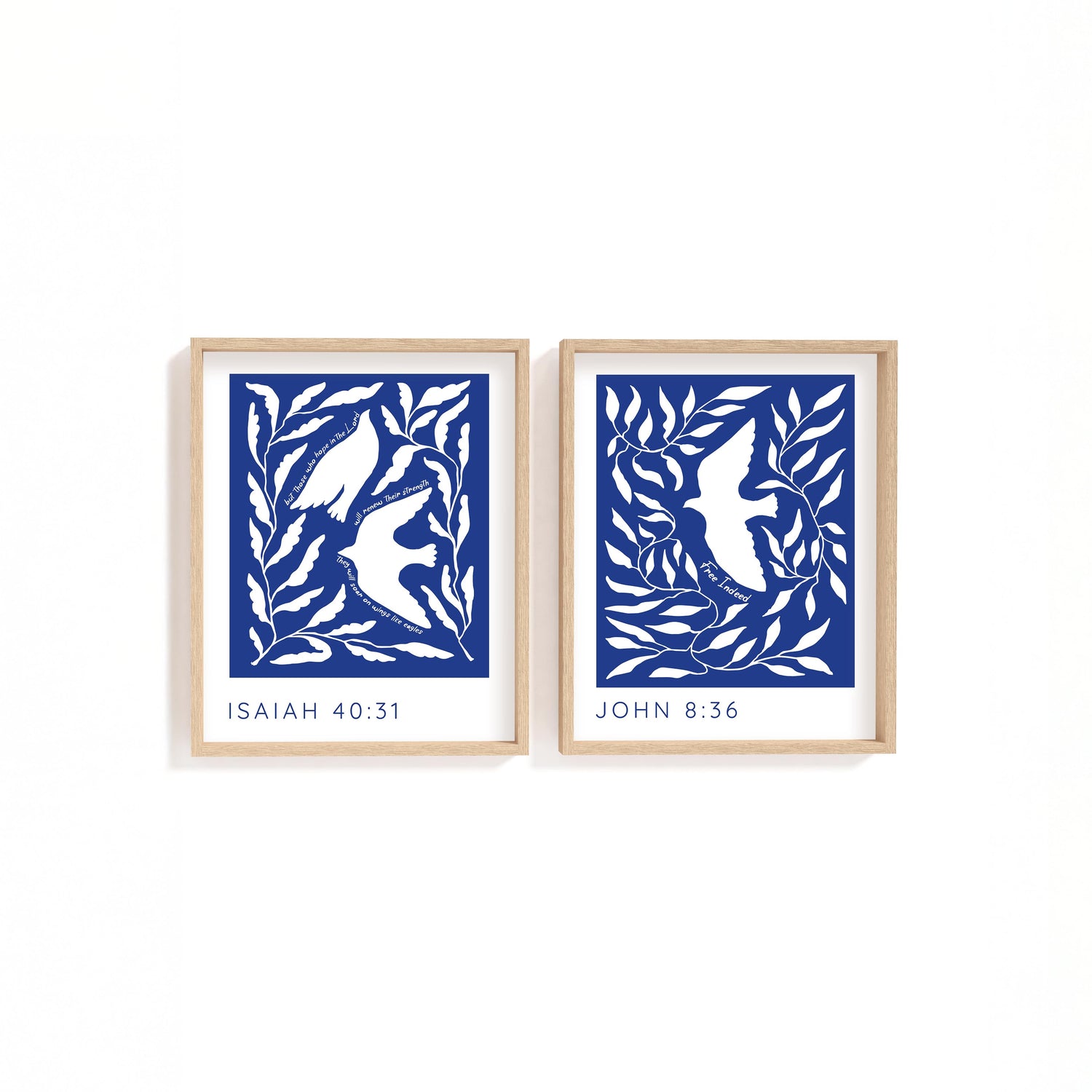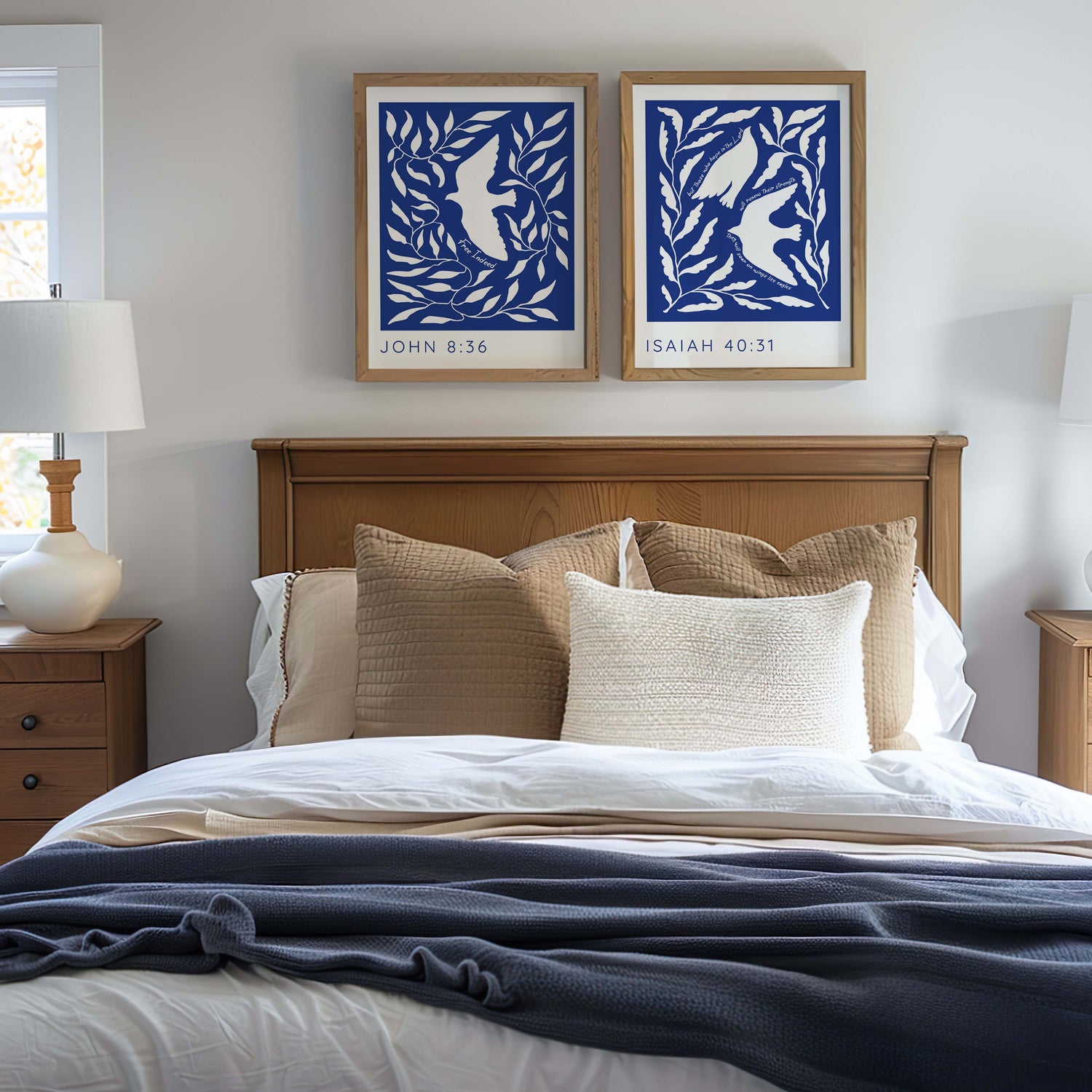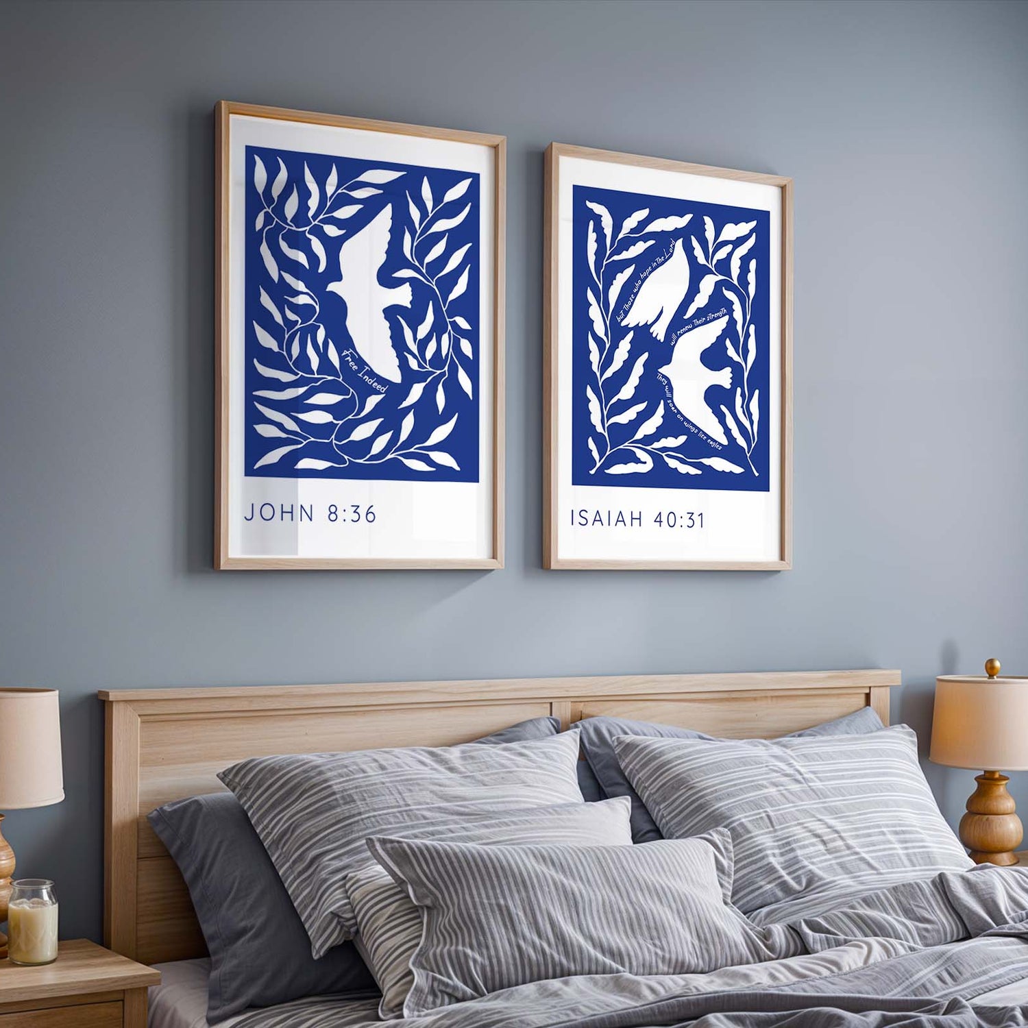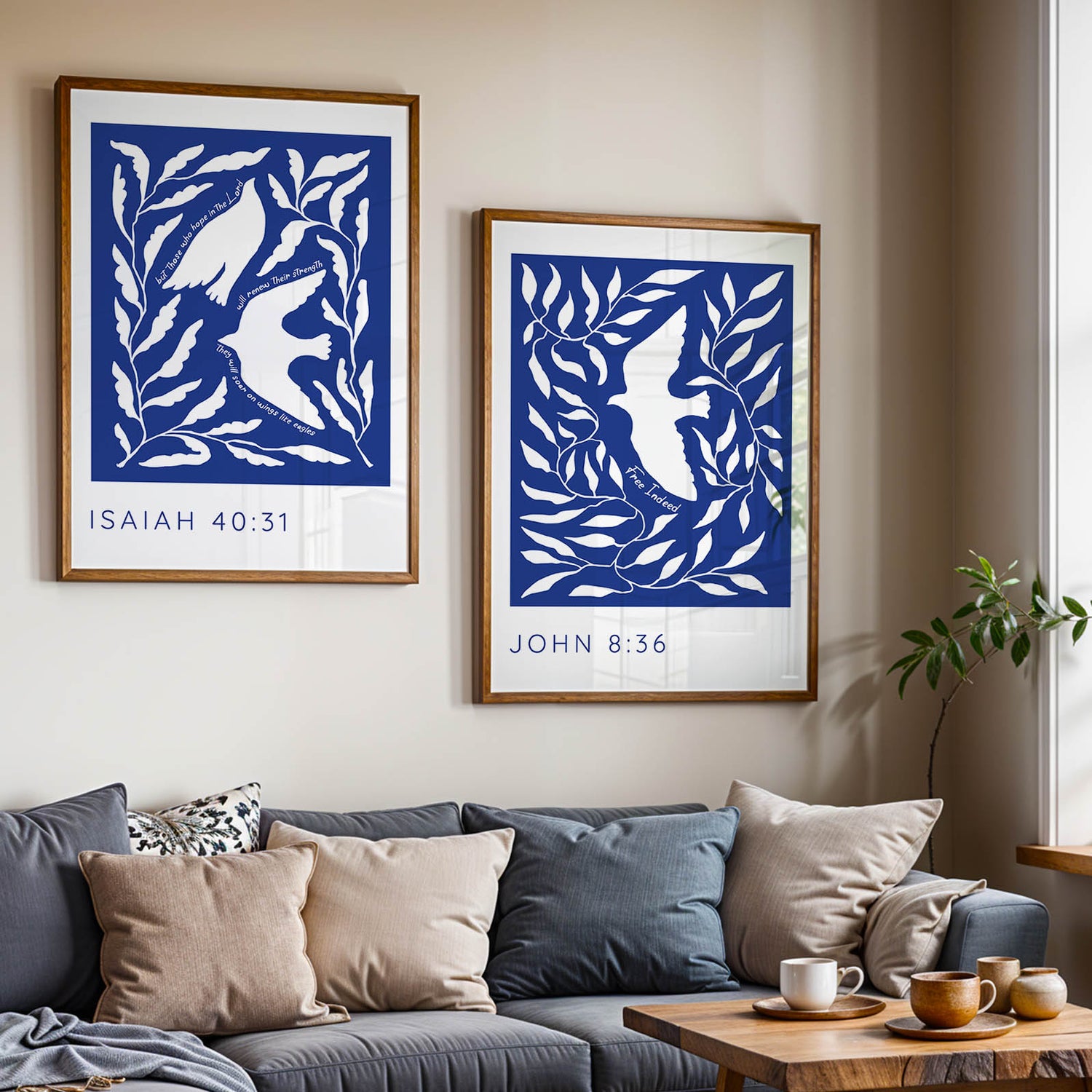 Freedom Christian Wall Art Print Set, Isaiah 40 31 & John 8 36 Bible Verse Prints, Blue Bird Scripture Decor