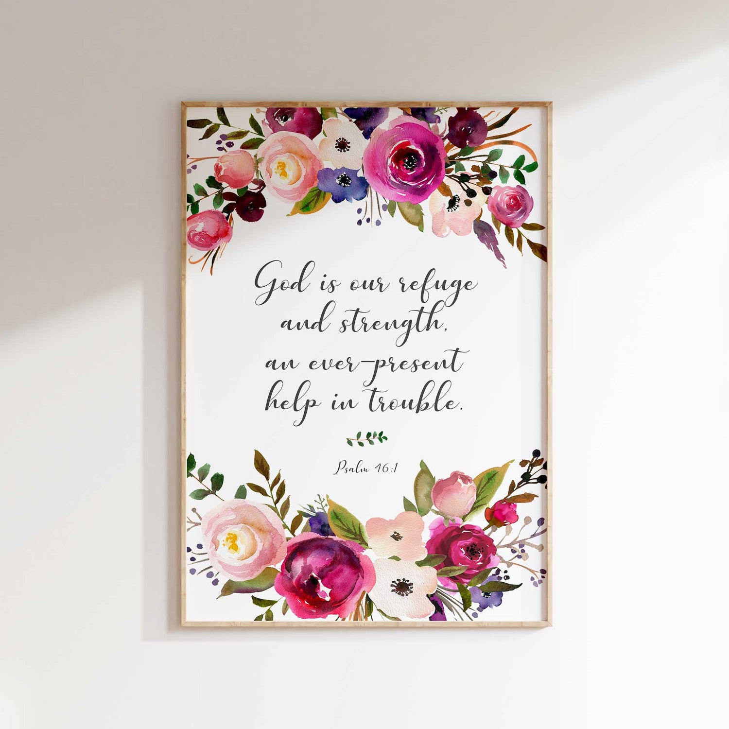 Featured prominently in the centre is the timeless verse from Psalm 46:1, which assures us that "God is our refuge and strength, an ever-present help in trouble." With its soothing hues and profound message, this print serves as a beacon of hope and solace in challenging times.
