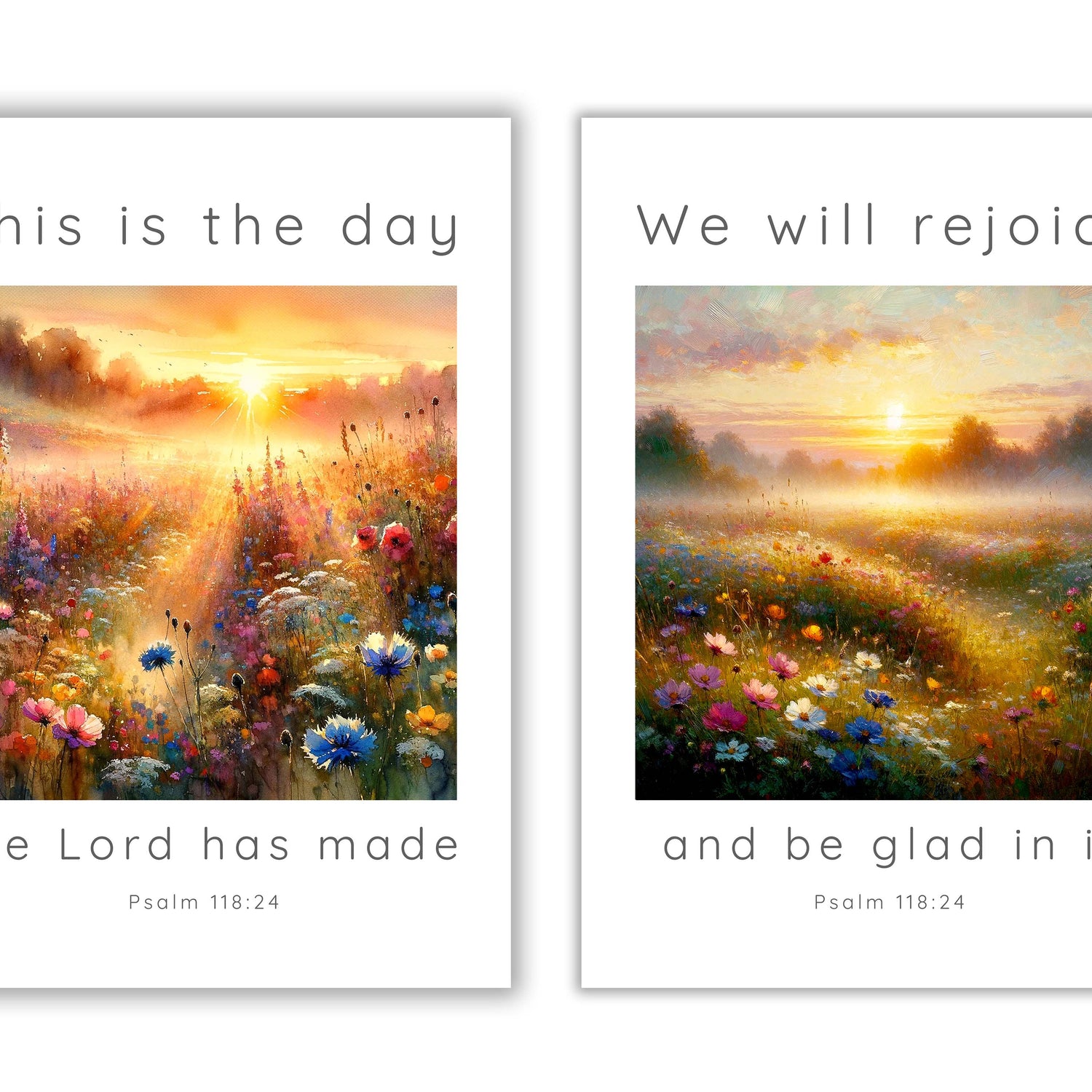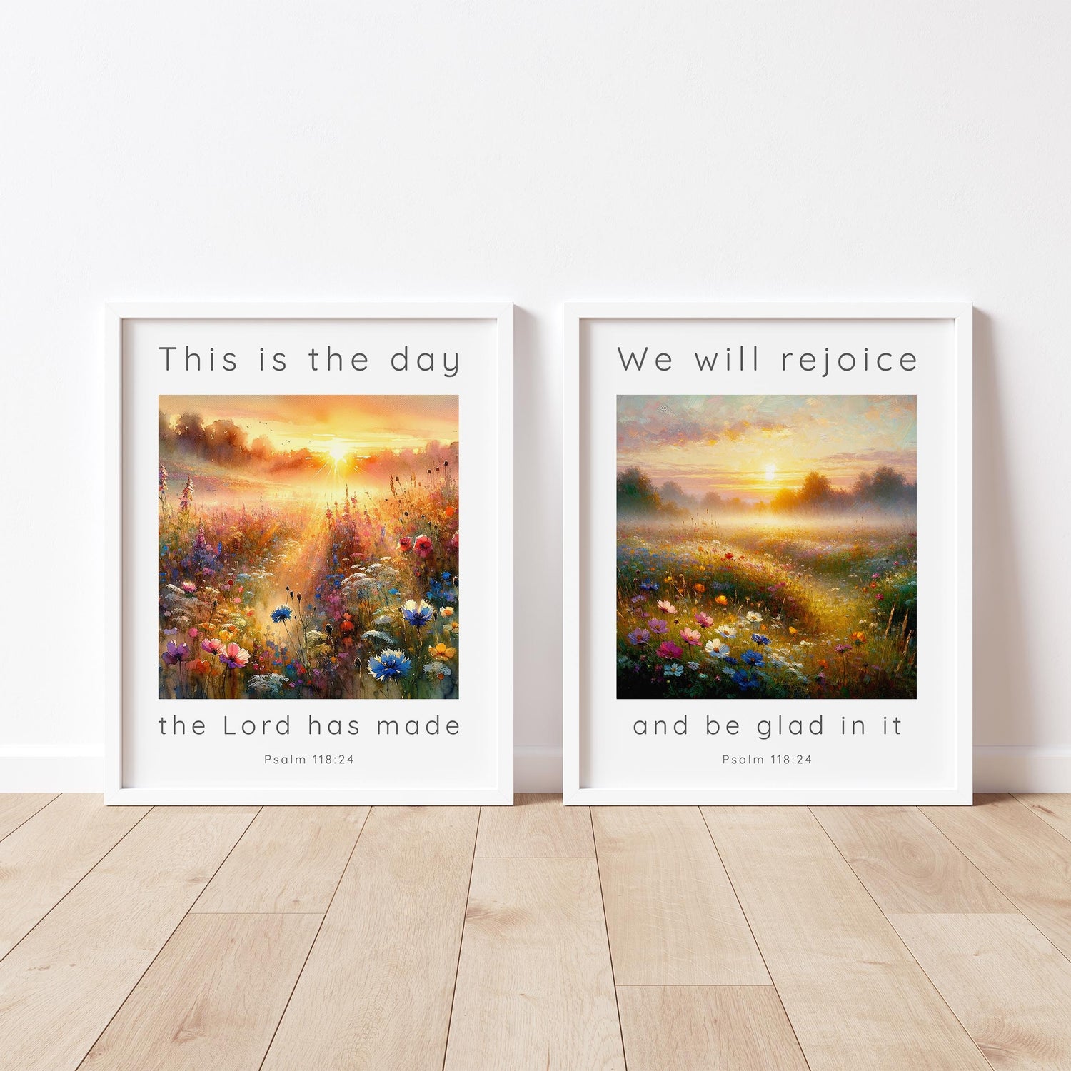 This is the Day The Lord Has Made Christian Wall Art Bible Verse Prints - Brighten your home with this beautiful set of Bible verse prints, featuring the uplifting message from Psalm 118:24. These two prints showcase a serene meadow at sunrise, filled with warm shades of yellow and orange, representing the beauty of a new day. The first print declares, "This is the day the Lord has made" while the second adds, "We will rejoice and be glad in it".