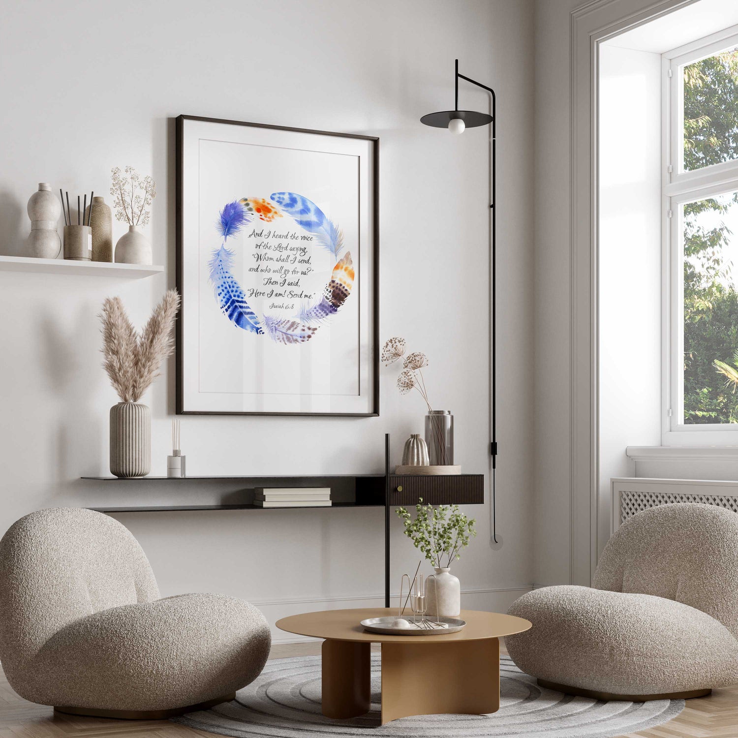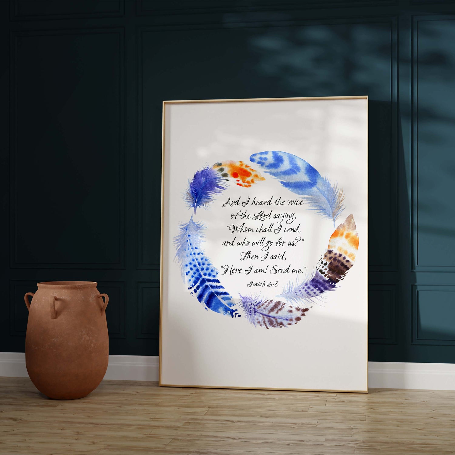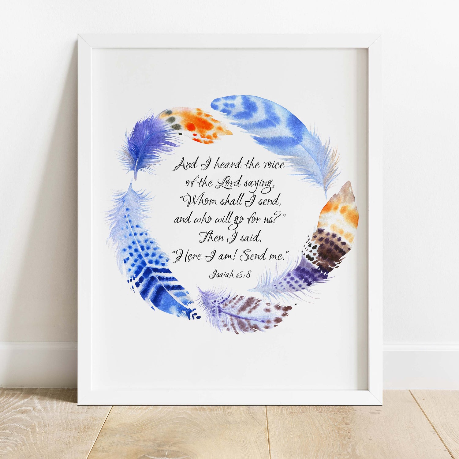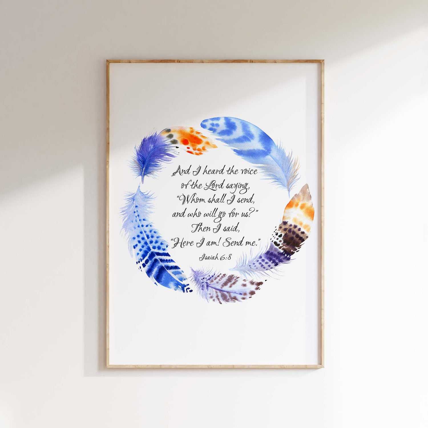 Here I am Send Me Christian Wall Art Print - Enhance your space with our exquisite Bible verse print, showcasing a stunning watercolour blue and orange feather wreath that exudes warmth and vibrancy. At the heart of this captivating design lies the inspiring verse from Isaiah 6:8, "Whom shall I send, and who will go for us?” Then I said, “Here I am! Send me.”