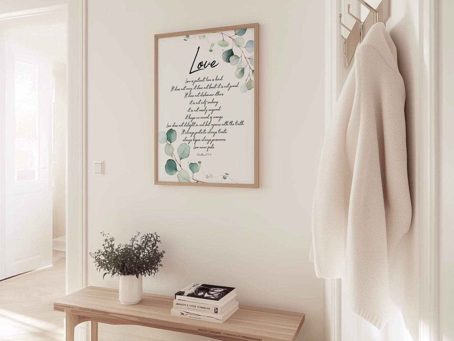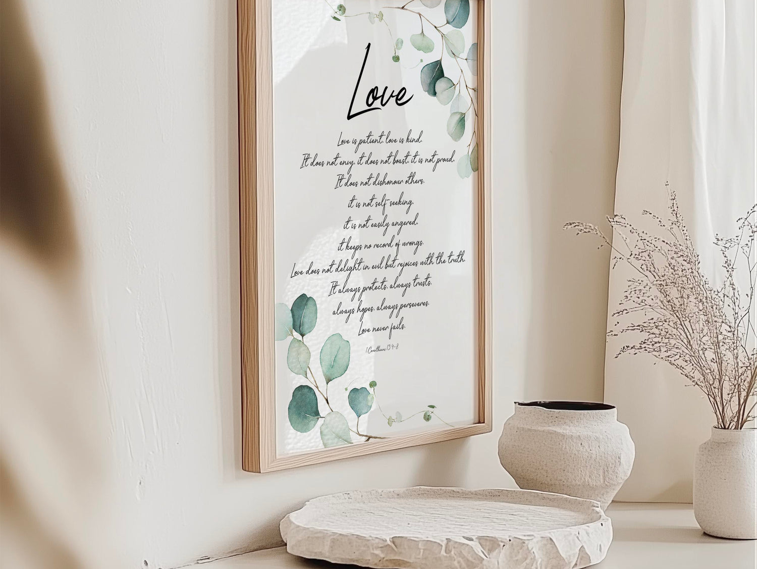It also makes a thoughtful and meaningful Christian gift, especially for weddings, anniversaries, engagements, or housewarmings. With its delicate floral details and powerful message, this 1 Corinthians 13 artwork brings grace, positivity, and spiritual depth to any space.