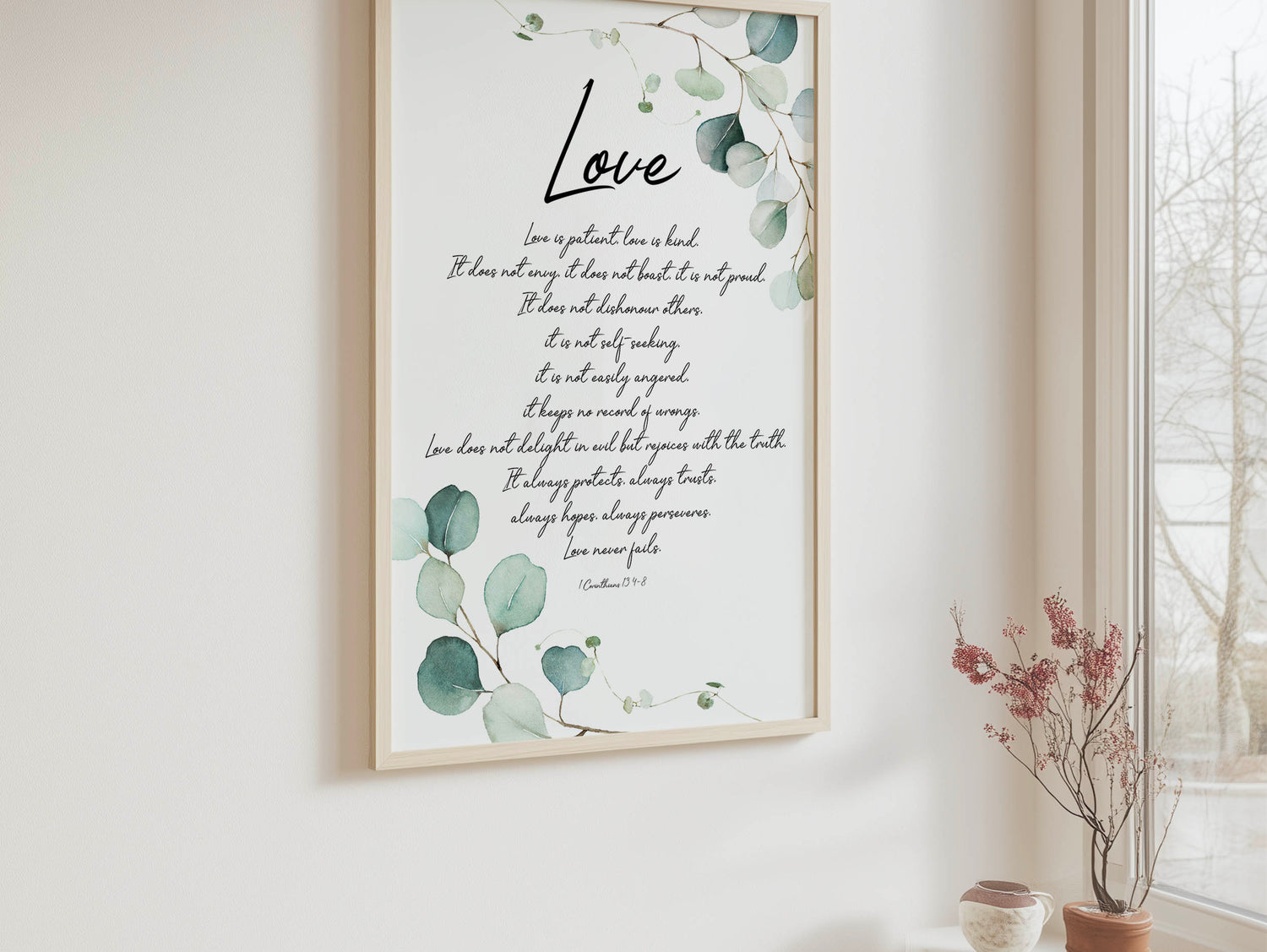 Love Is Patient Christian Wall Art Print, 1 Corinthians 13 Botanical Bible Verse Scripture Print, Wedding Theme Faith Inspired Home Decor