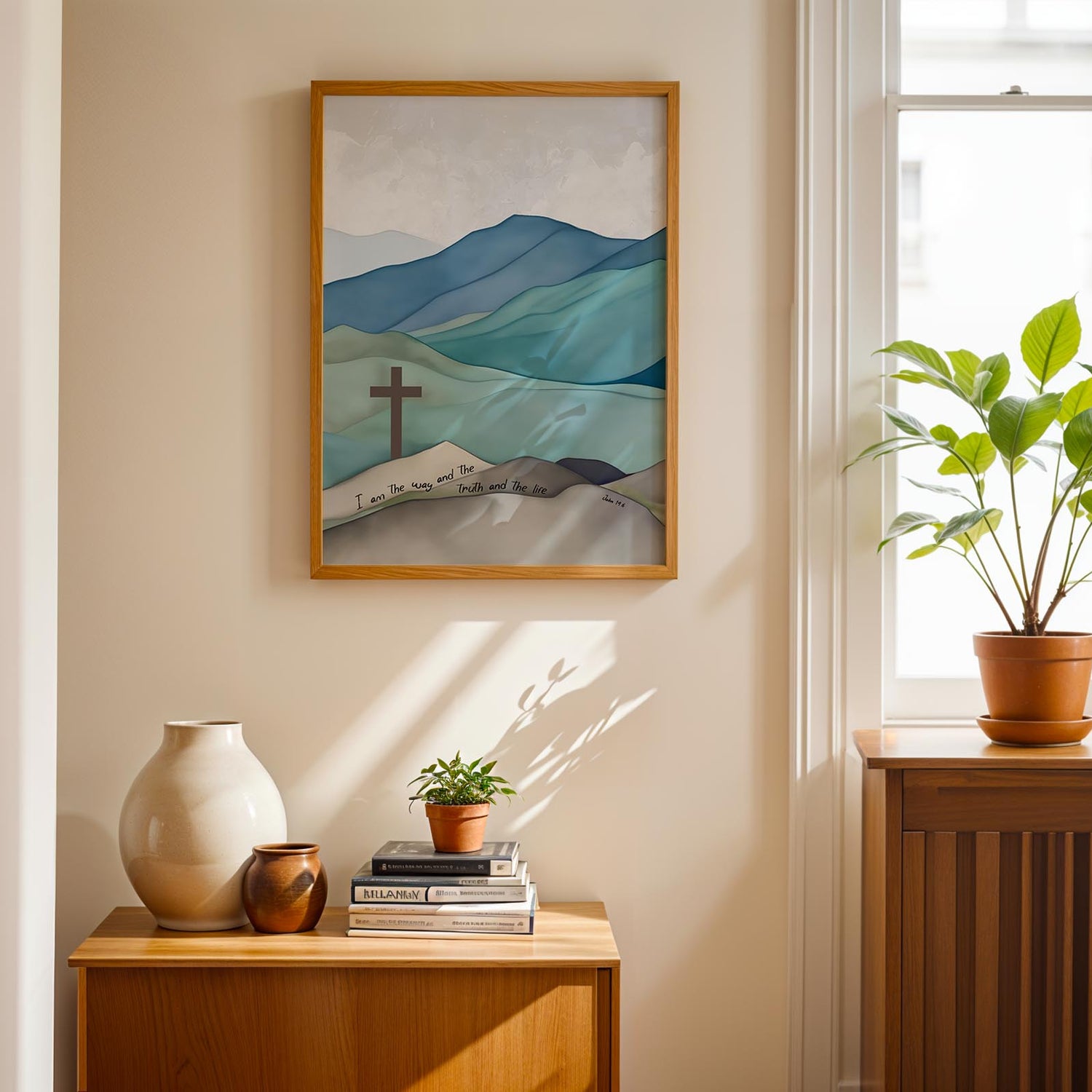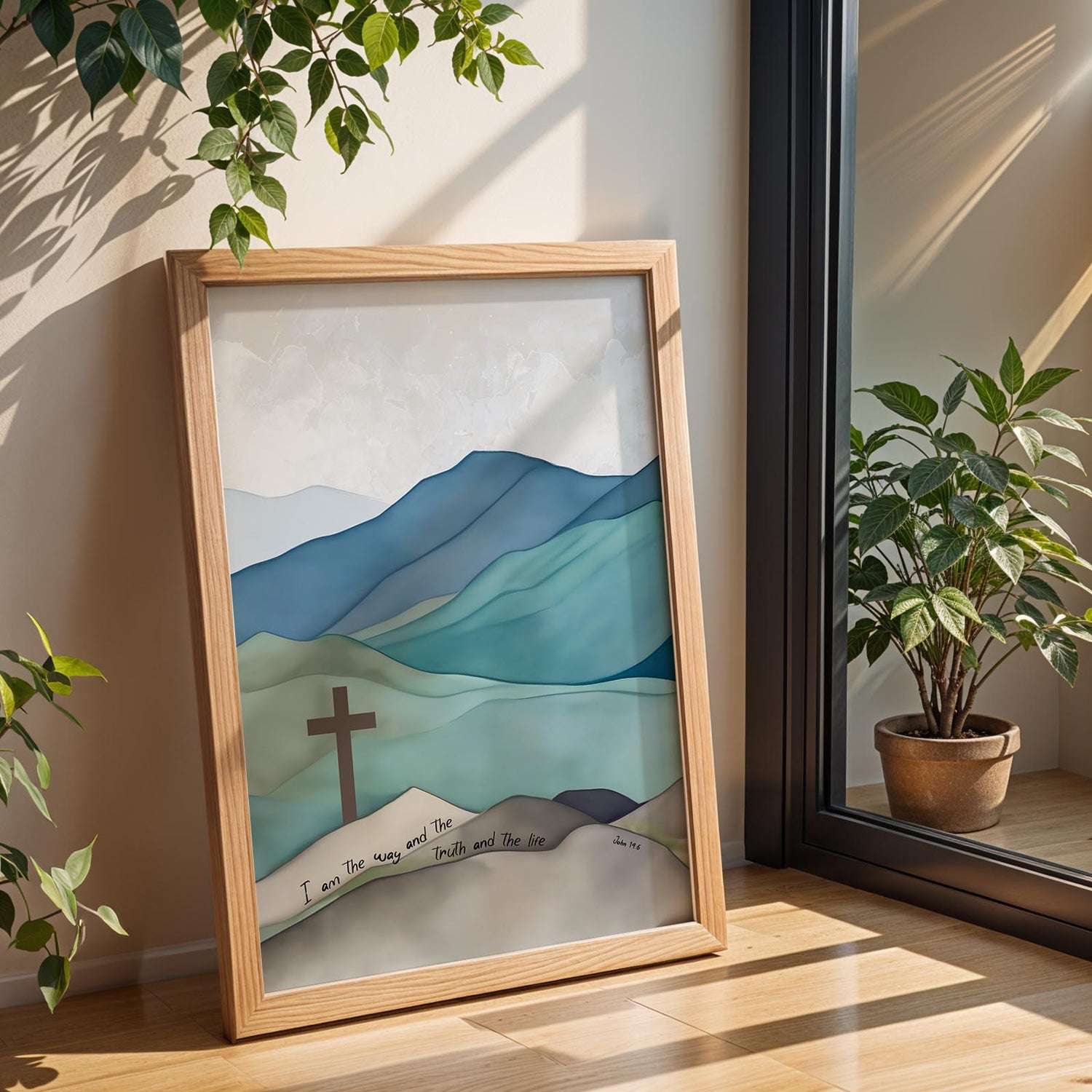 I Am The Way The Truth And The Life Bible Verse Print, John 14:6 Christian Wall Art, Cross on a Mountain Scripture Quote