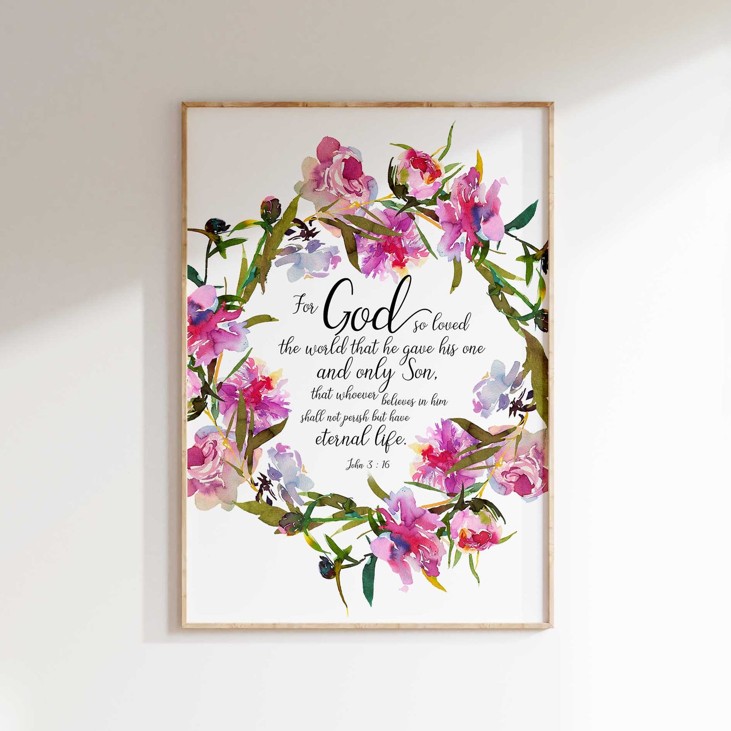 For God So Loved The World Christian Wall Art Print - Transform your space with our exquisite Bible verse print, featuring a captivating pink floral wreath encircling the powerful words of John 3:16. This timeless verse, "For God so loved the world that he gave his one and only Son that whoever believes in him shall not perish but have eternal life" serves as a reminder of God's boundless love and grace.