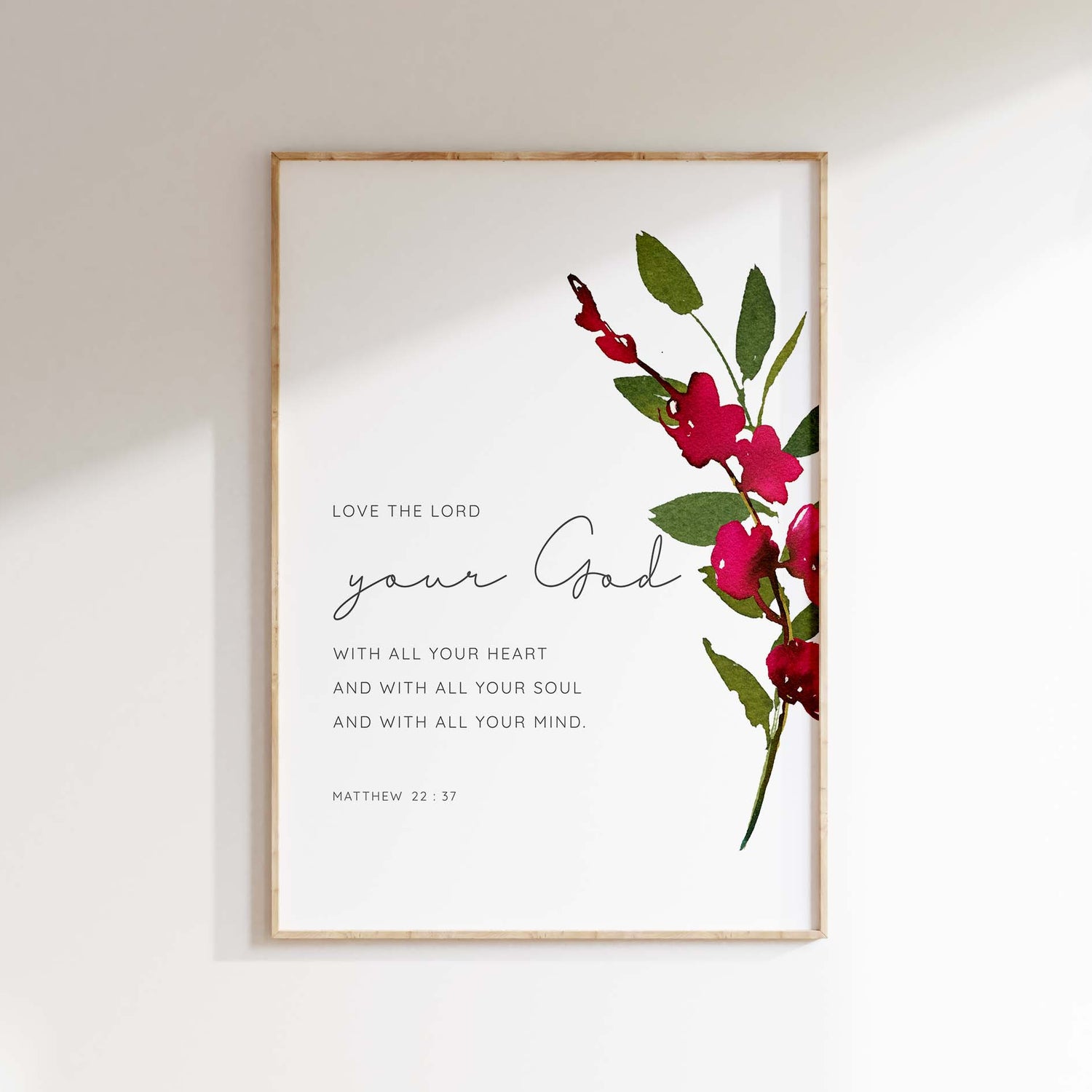 Love the Lord Your God Christian Wall Art Print, Floral Bible Verse