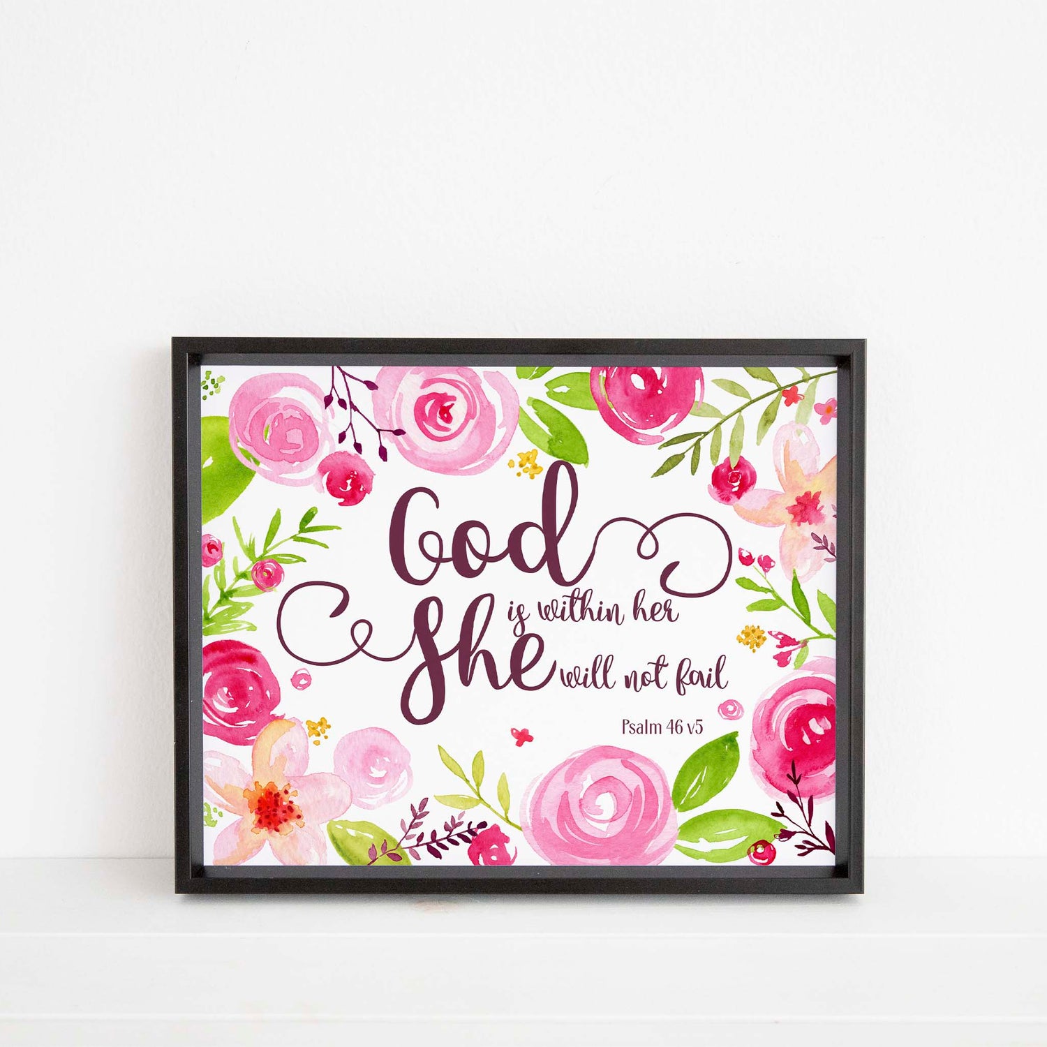God Is Within Her Christian Wall Art Print - A exuberant floral Bible Verse Print, a captivating fusion of scripture and botanical elegance. This print features the empowering verse from Psalm 46:5, gracefully surrounded by a beautiful floral design, creating a visually enchanting and spiritually uplifting piece.