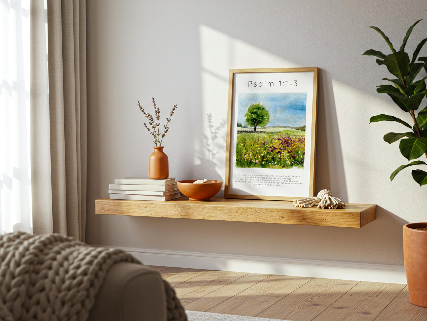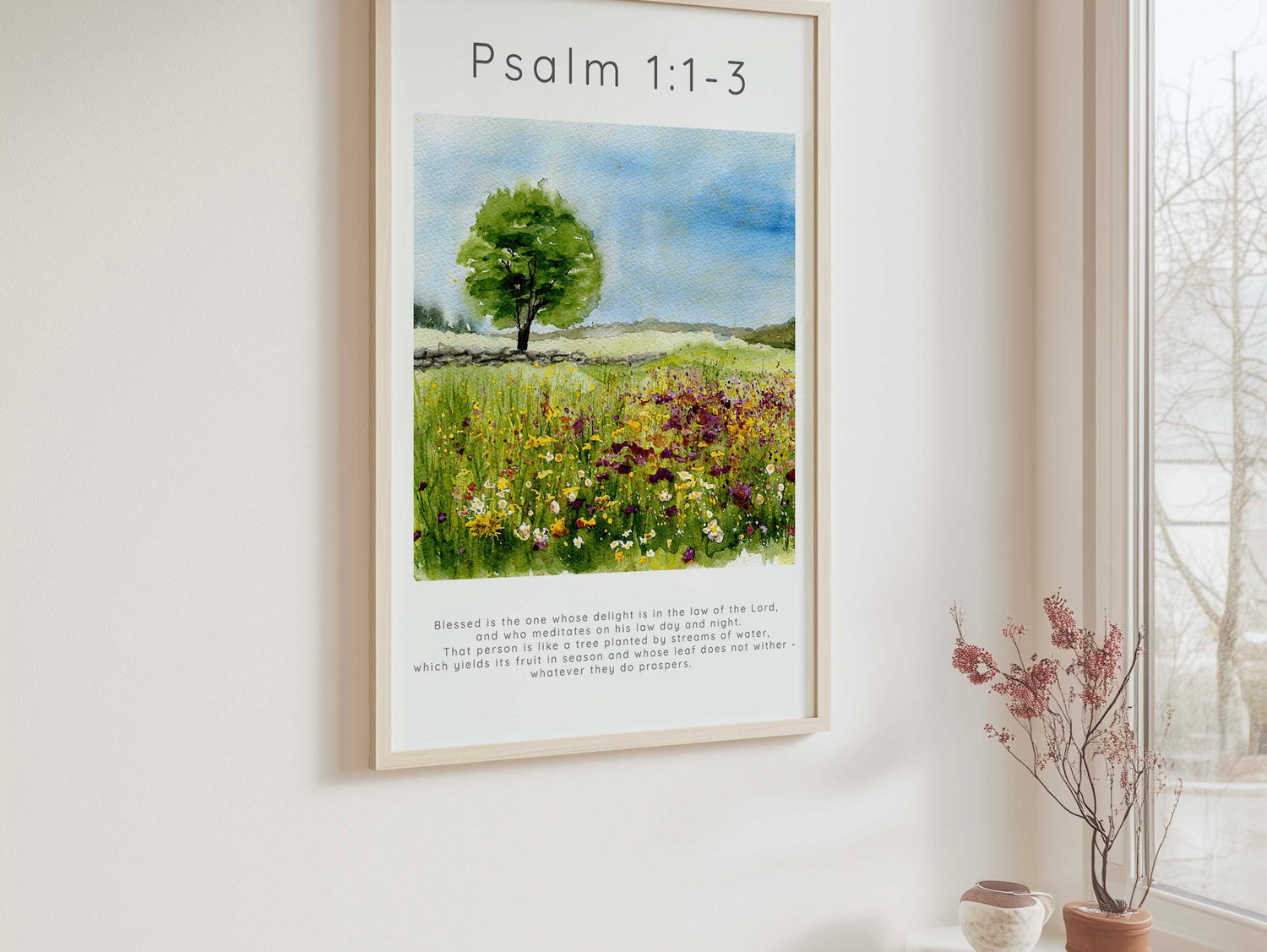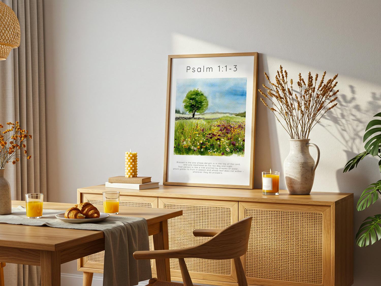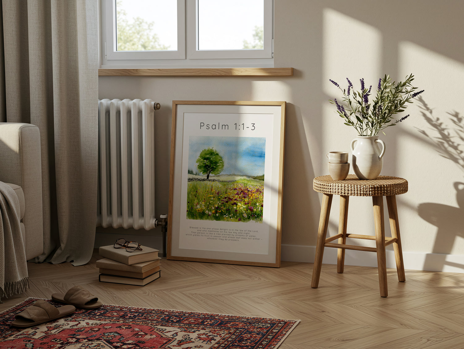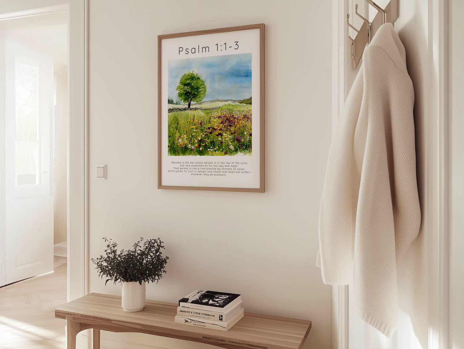 Blessed is the One Christian Wall Art Print - Rooted in peace and flourishing in faith, our Psalm 1:1–3 Christian wall art captures the beauty of a life deeply planted in God’s Word. Inspired by the imagery of a tree growing beside streams of living water, this artwork brings a gentle sense of calm and blessing to any home.