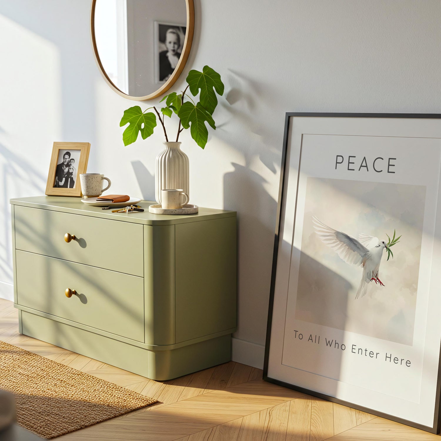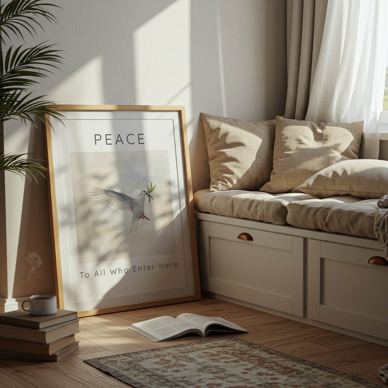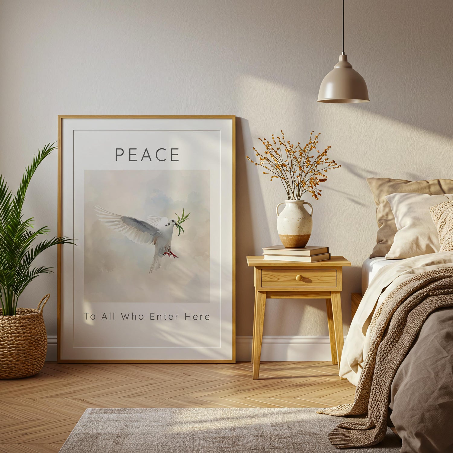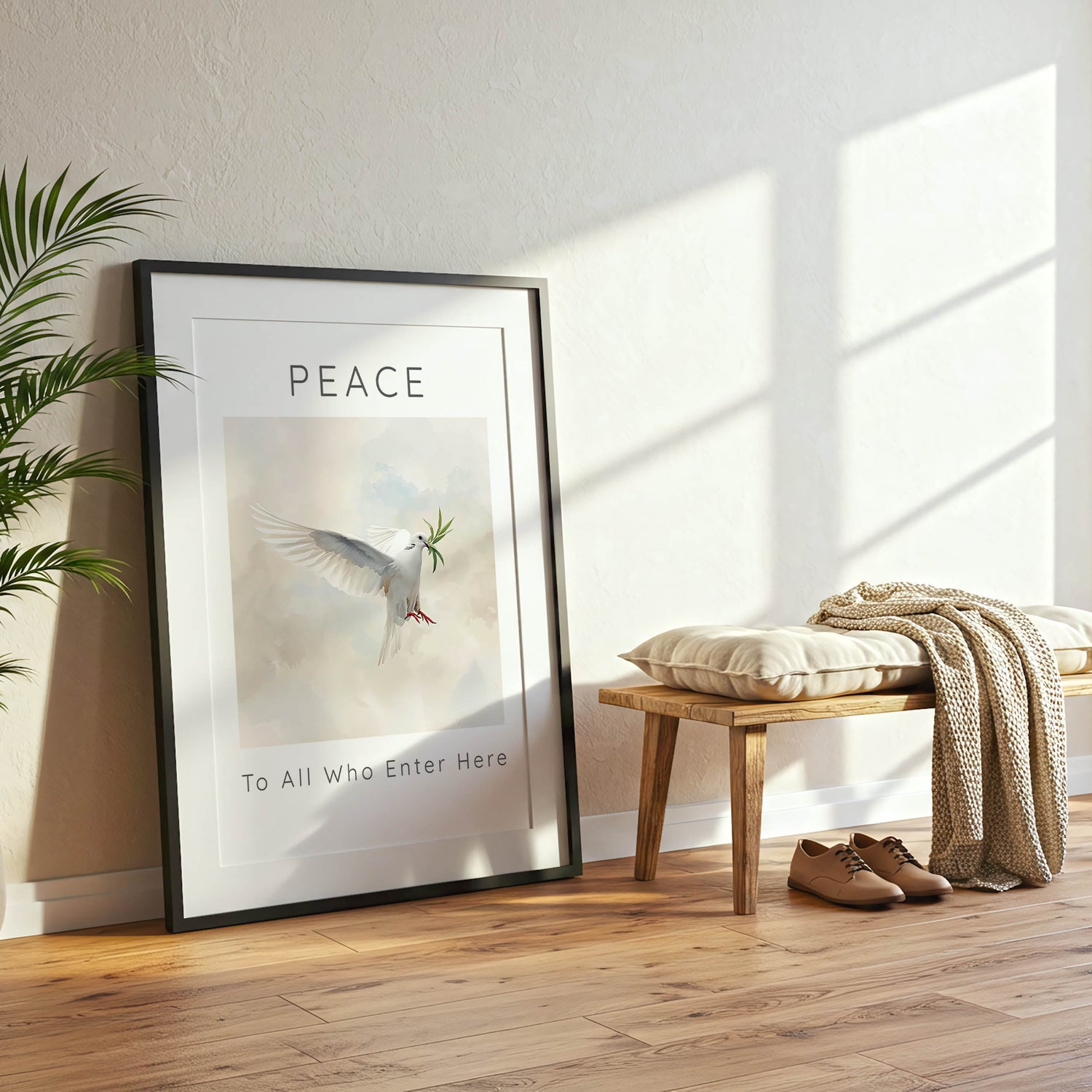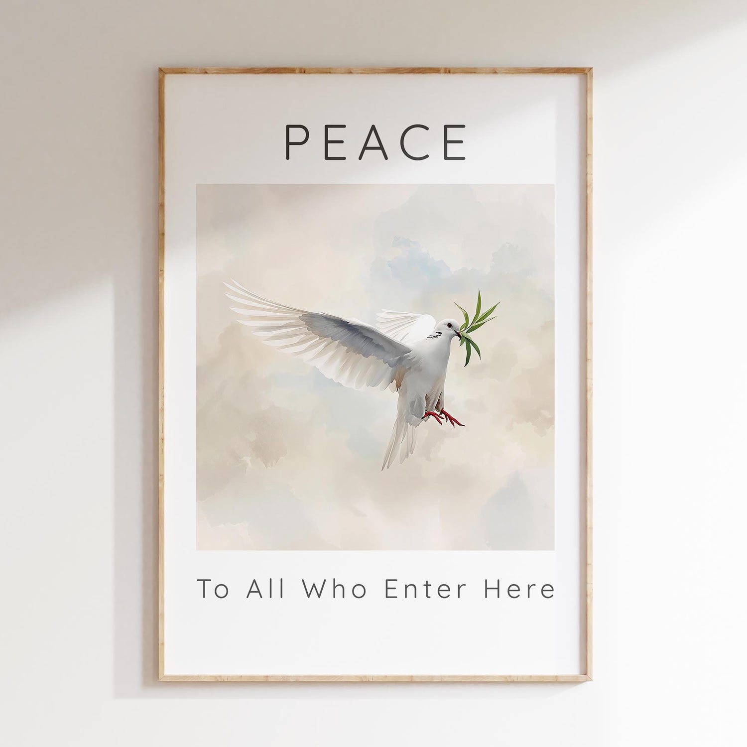 Peace To All Who Enter Here Christian Wall Art Print - Invite calm and grace into your home with this Peace – To All Who Enter Here Christian wall art print. Designed as a gentle reminder of God’s presence and peace, it features a beautifully detailed white dove in flight, carrying an olive branch — a symbol of hope, blessing, and the Spirit of God.