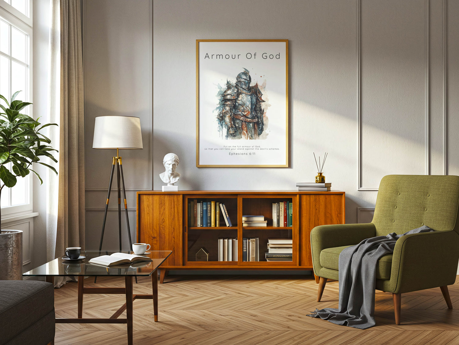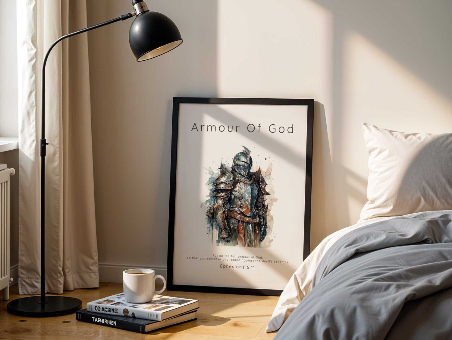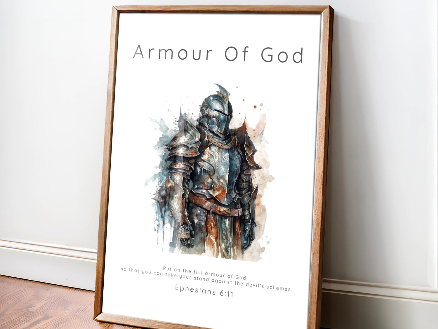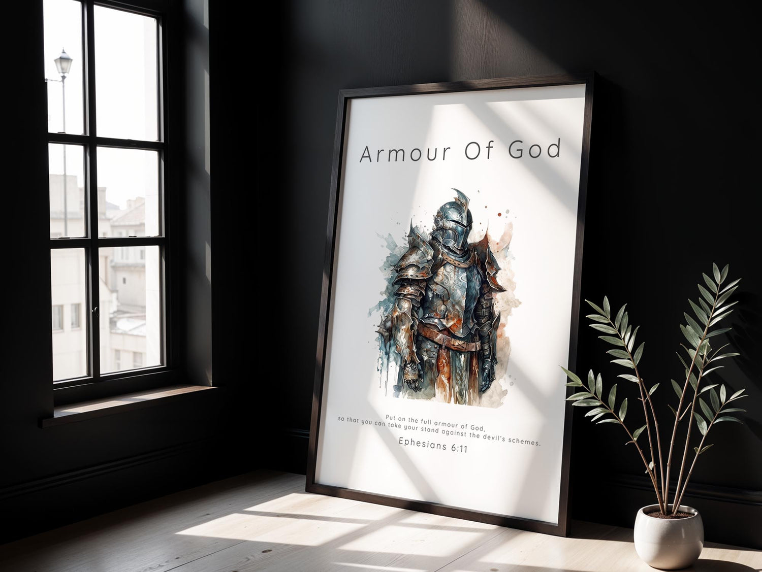 Armour of God Christian Wall Art Print - Our Armour of God Christian Wall Art Print beautifully captures the strength and courage of faith, featuring a bold warrior standing firm in the armour of God. Inspired by Ephesians 6:11Put on the full armour of God so that you can take your stand against the devil’s schemes.” — this striking artwork serves as a powerful daily reminder of spiritual resilience and divine protection.