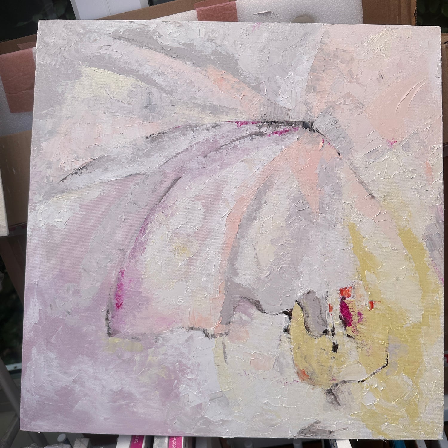 The artwork featured is 'Taking Flight' by our resident artist, Kate Shephard. It shows delicate layers of pinks, whites, yellows and soft textures, echoing the way love often appears softly in our everyday lives — in small kindnesses, quiet moments, and gentle faith. We created this design to feel comforting and light, something that quietly lifts the atmosphere of a room without overwhelming it.