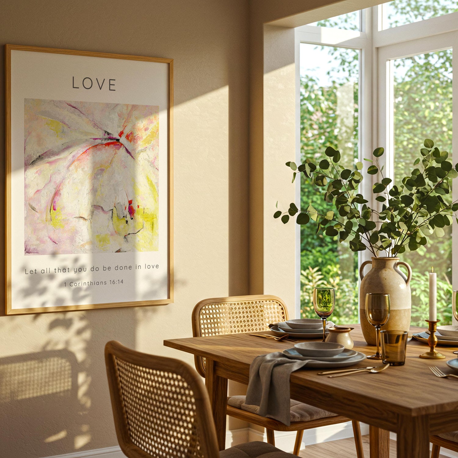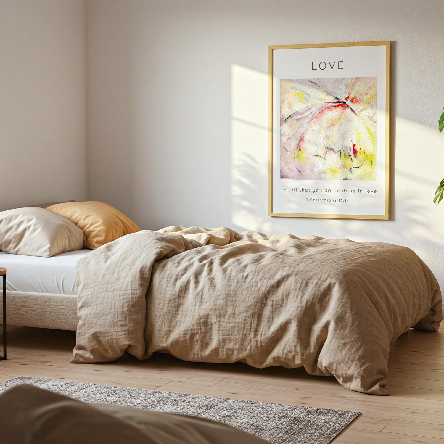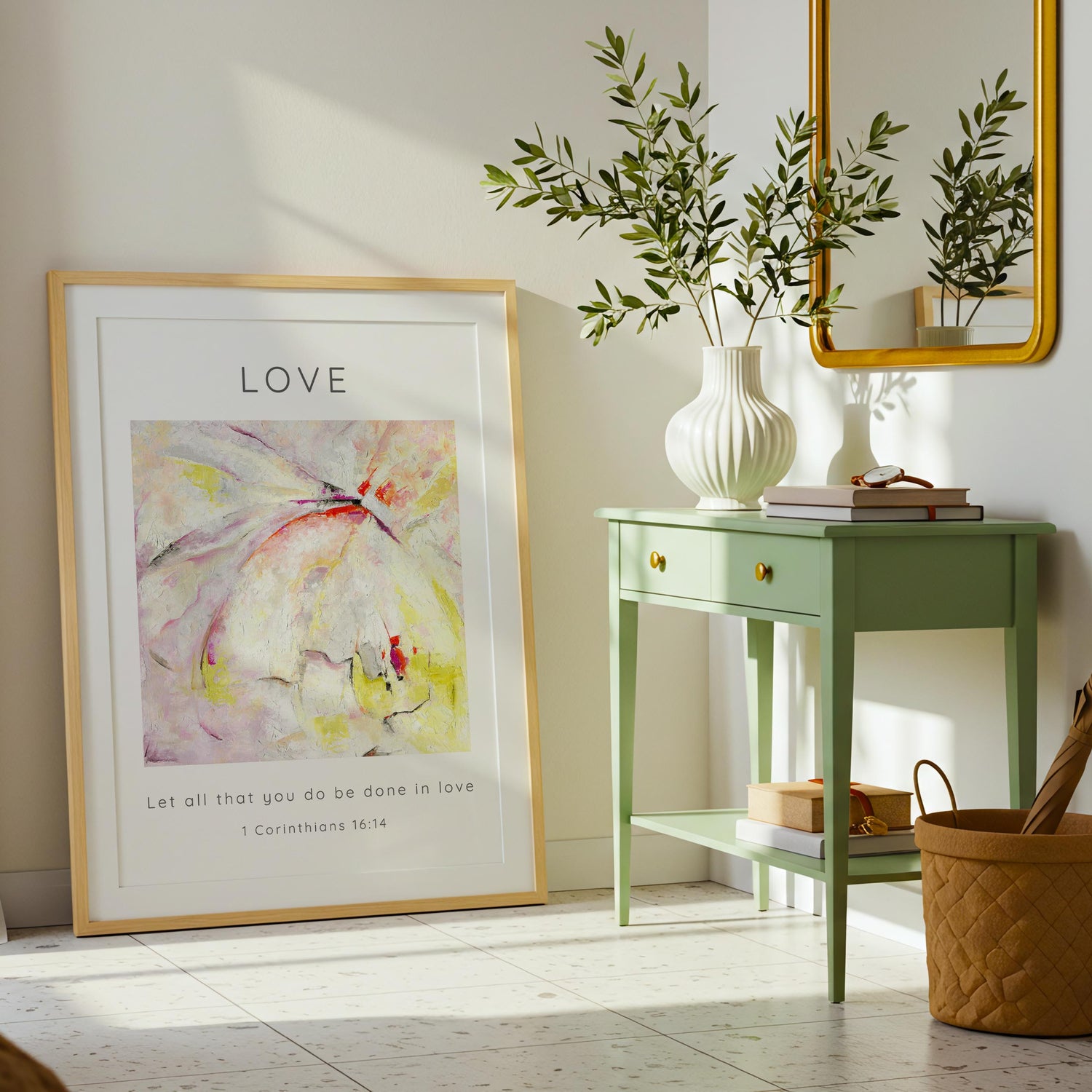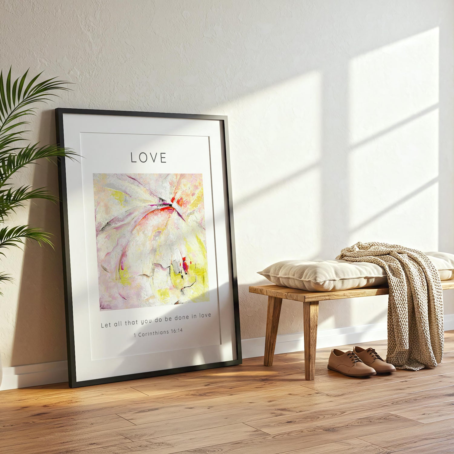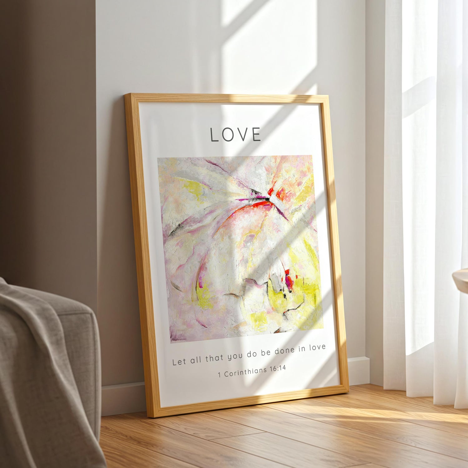 Let All That You Do Be Done In Love Abstract Bible Verse Print - This Love Bible Verse Wall Art Print is a gentle, uplifting reminder of the beautiful call in Scripture to let every part of our lives be marked by love. Inspired by the words of 1 Corinthians 16:14, this piece brings together soft abstract brushstrokes, warm tones and a peaceful sense of movement — creating an abstract christian print that feels both modern and deeply meaningful. Whether you’re filling a quiet corner of your home or creating a place of reflection and prayer, this artwork brings a lovely sense of calm and encouragement.
