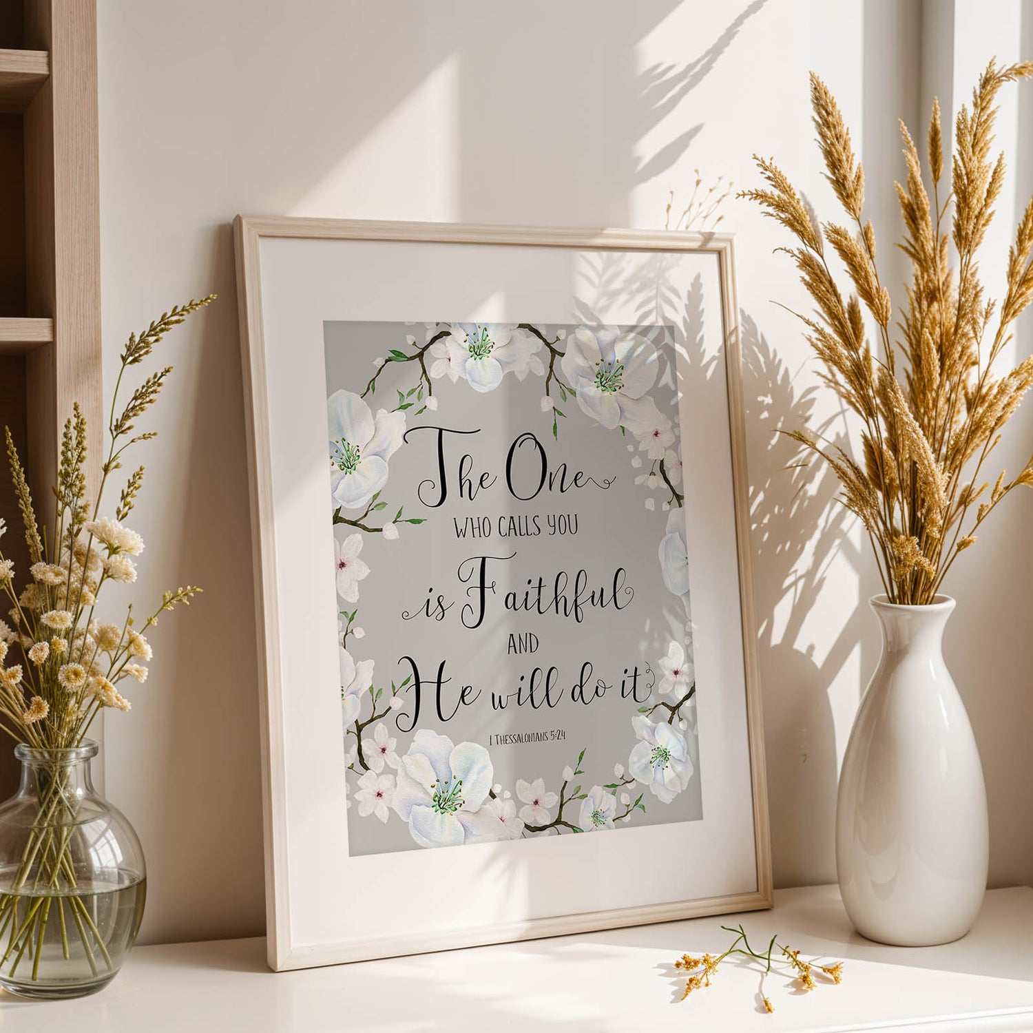 1 Thessalonians 5 24 Christian Wall Art Print - Introducing our beautifully designed Bible Verse Print, a harmonious blend of scripture and artistry that brings to life the profound message of faith. This exquisite print showcases the inspiring words from 1 Thessalonians 5:24, "The one who calls you is faithful, and he will do it," surrounded by a delicate array of white blossoms.