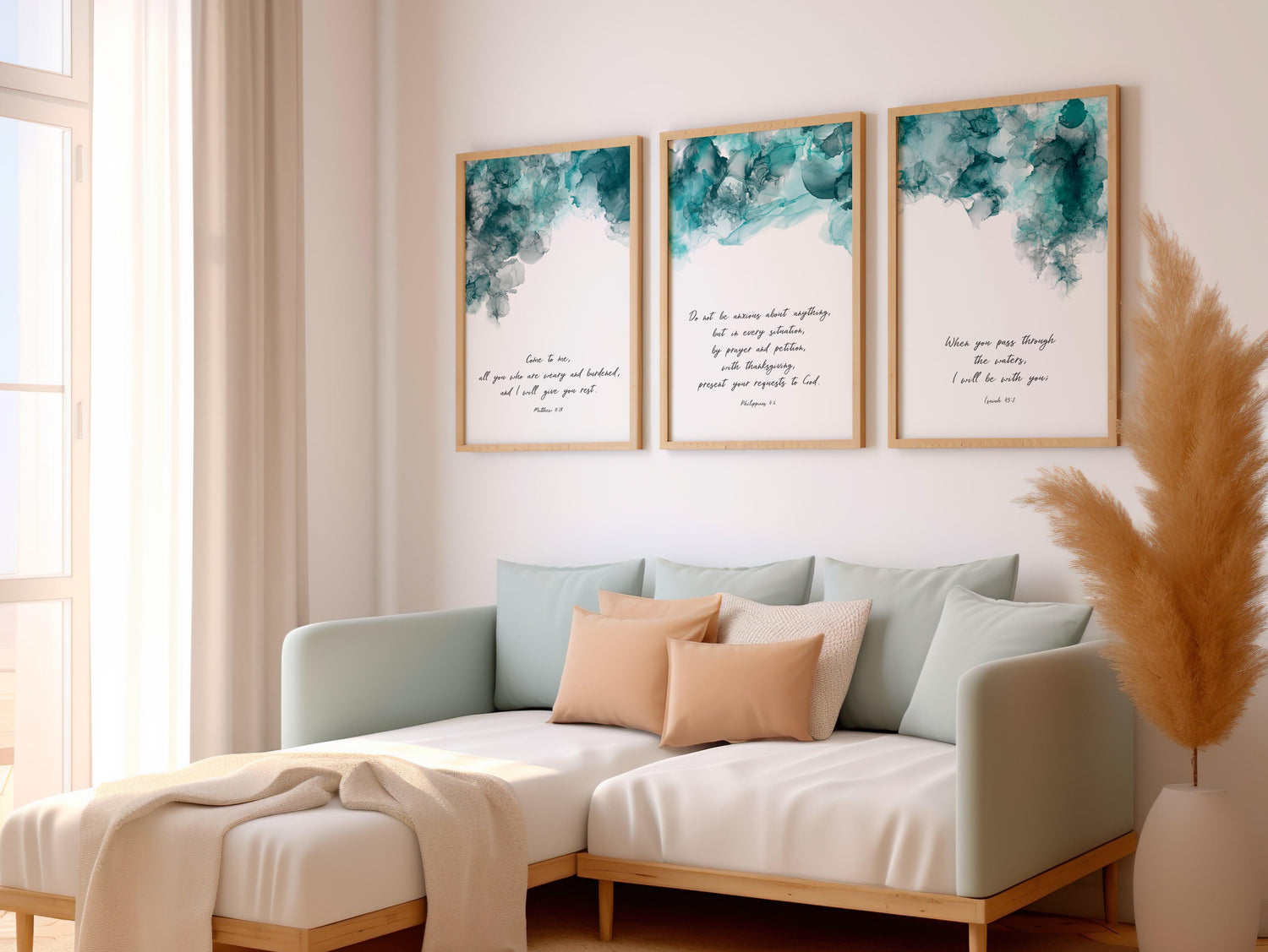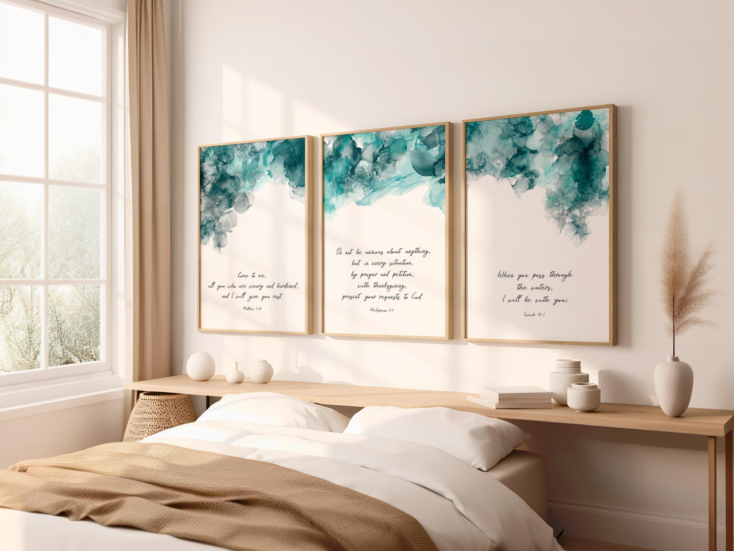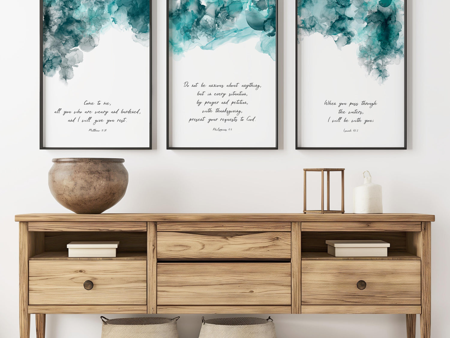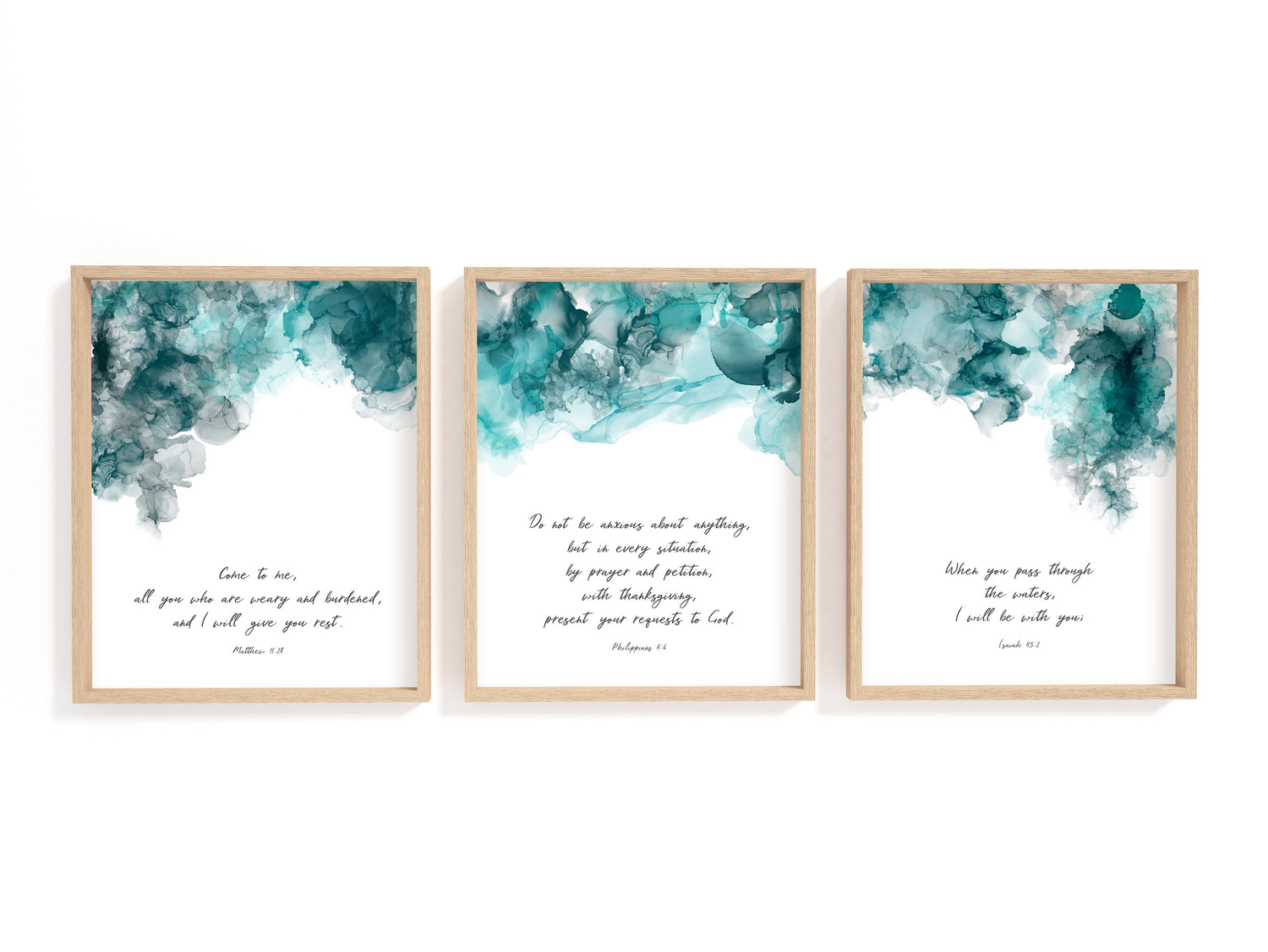 Comforting Christian Wall Art 3 Print Set - Bring calm, beauty and faith into your home with this Comforting Christian Wall Art 3 Print Set. Each piece features a captivating blend of turquoise and black ink, creating a striking abstract design that feels both modern and deeply peaceful. The collection includes three powerful Bible verses to inspire, comfort and uplift your heart every day.