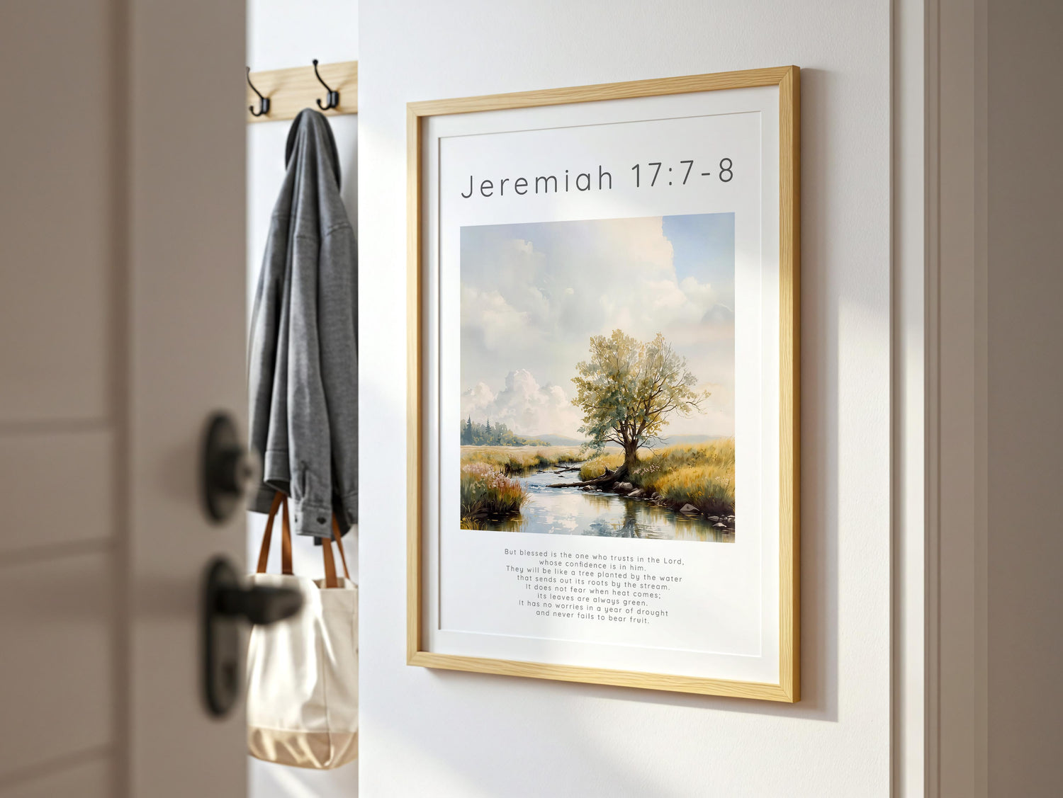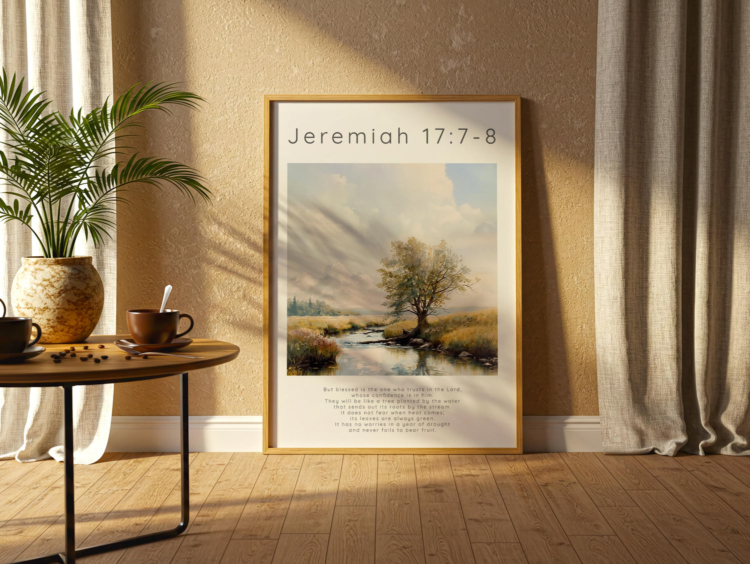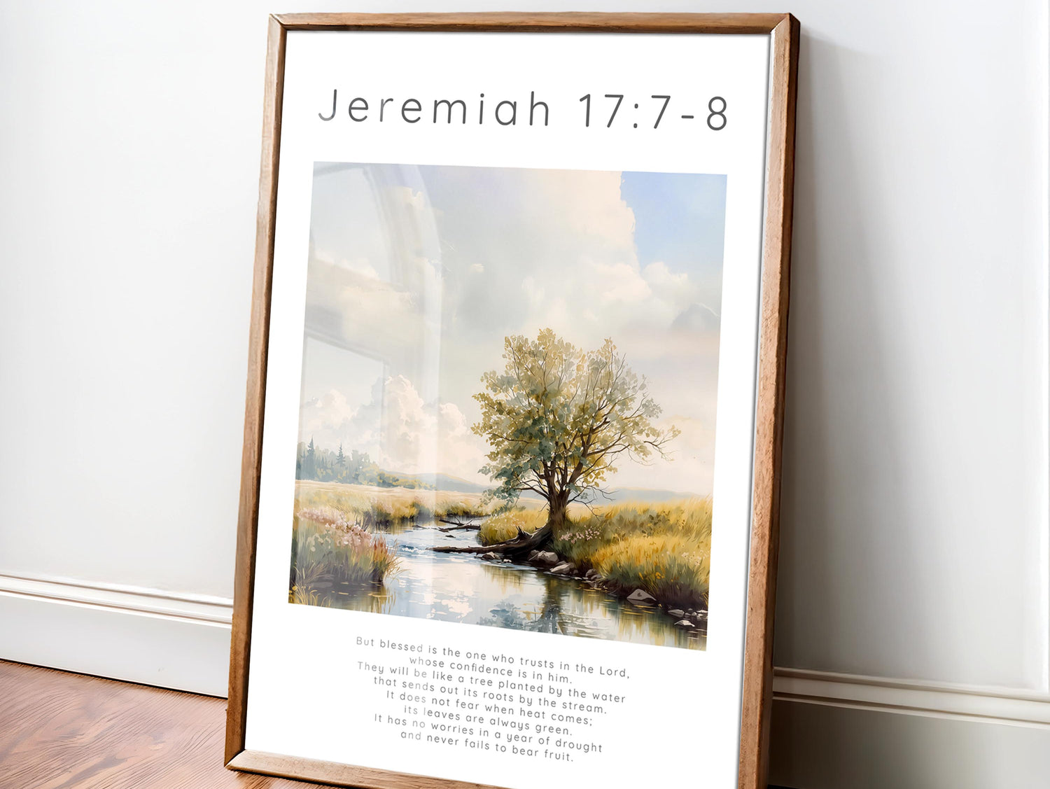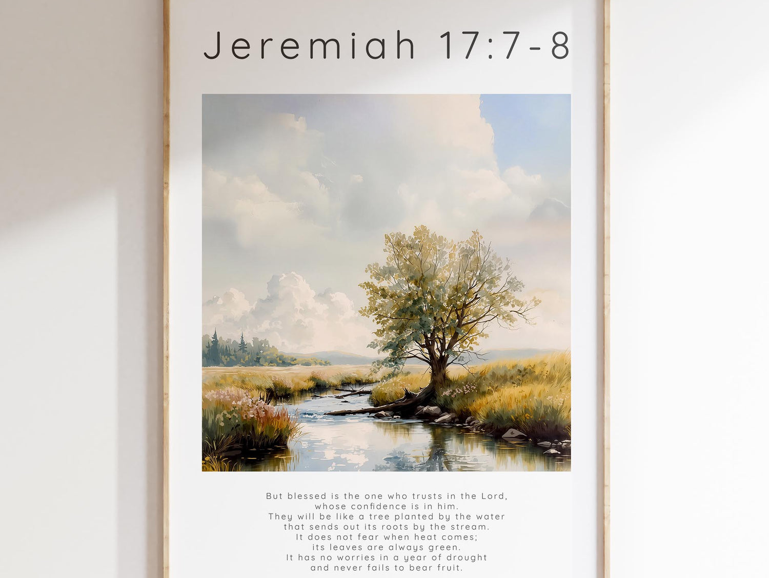 Blessed Is The One Who Trusts In The Lord, Jeremiah 17:7-8, Christian Landscape Scripture Print, River And Tree Faith Wall Art