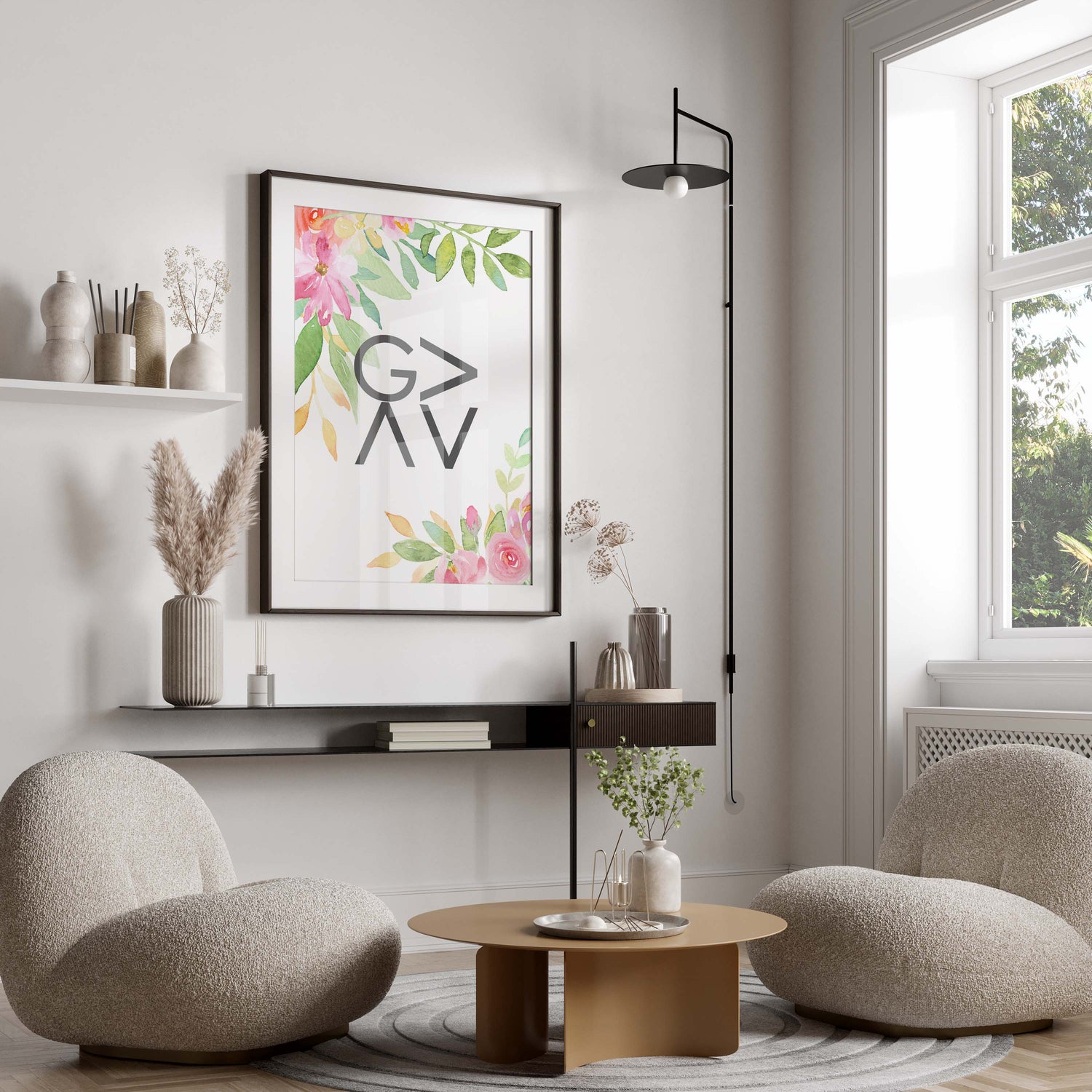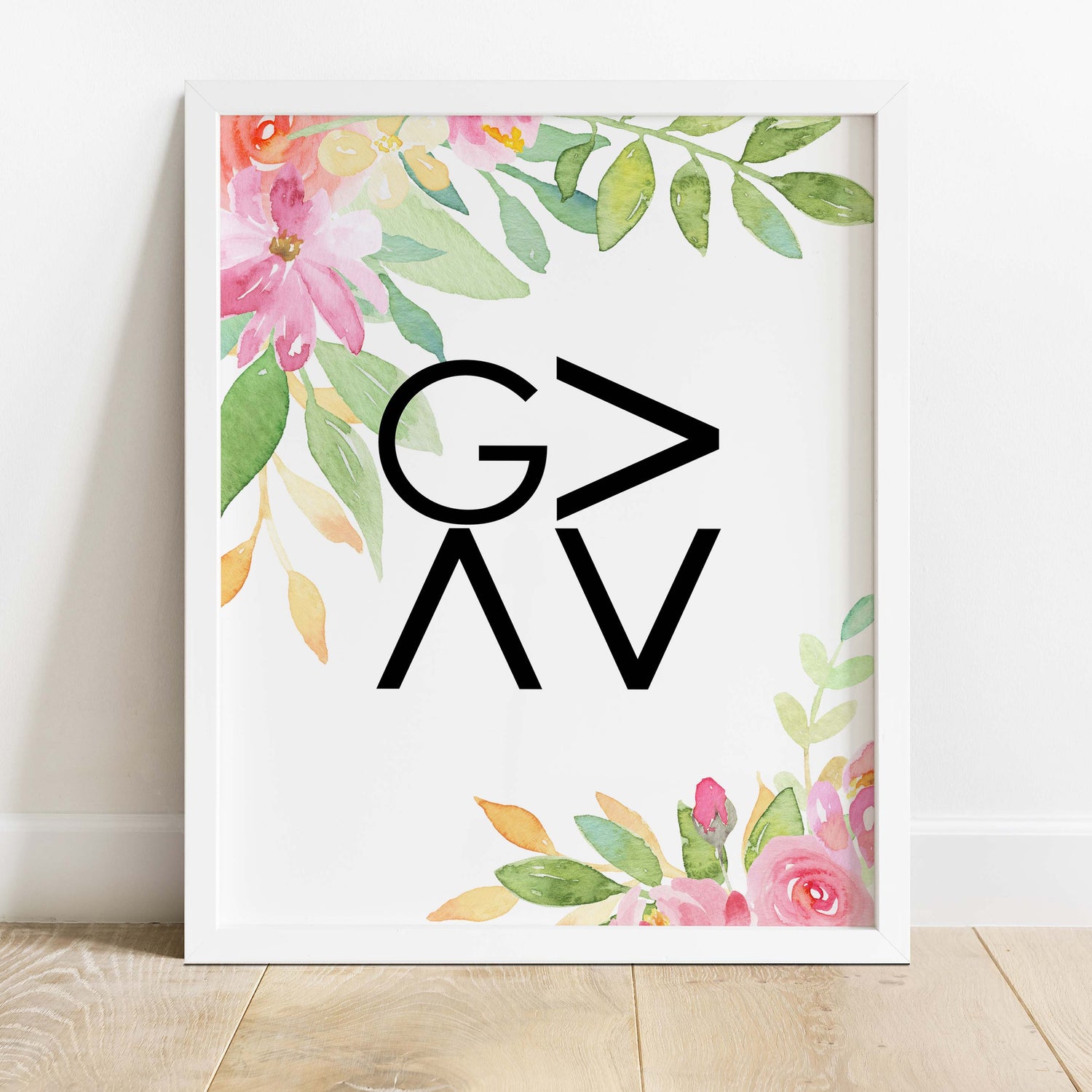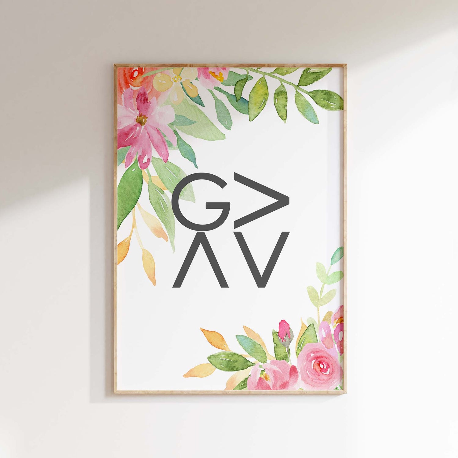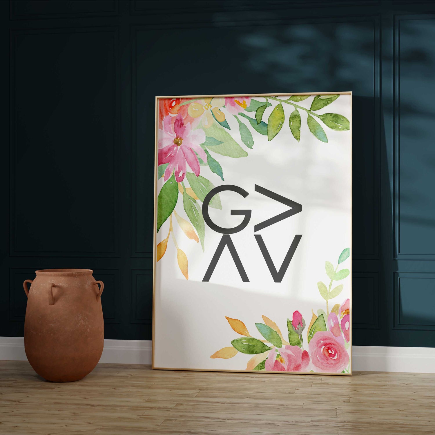 God is Greater than the Highs And Lows Christian Wall Art Print - A pretty watercolour Christian Saying Print, a harmonious blend of faith and botanical elegance. This print features the uplifting saying, 'God is Greater than the Highs And Lows,' delicately surrounded by a beautiful floral design, creating a visually enchanting and spiritually uplifting piece.