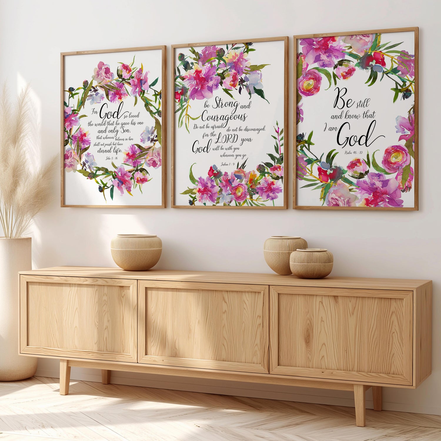 Floral Christian Wall Art Print Set of 3, Pretty Bible Verse Posters