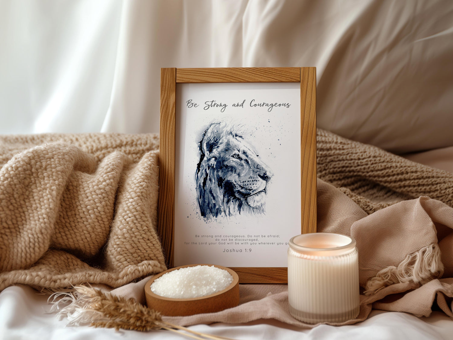 Let this bold and beautiful lion print remind you each day to stand firm in faith. May its powerful imagery and timeless words from Joshua 1:9 fill your home with courage, comfort, and the assurance that God is always with you.