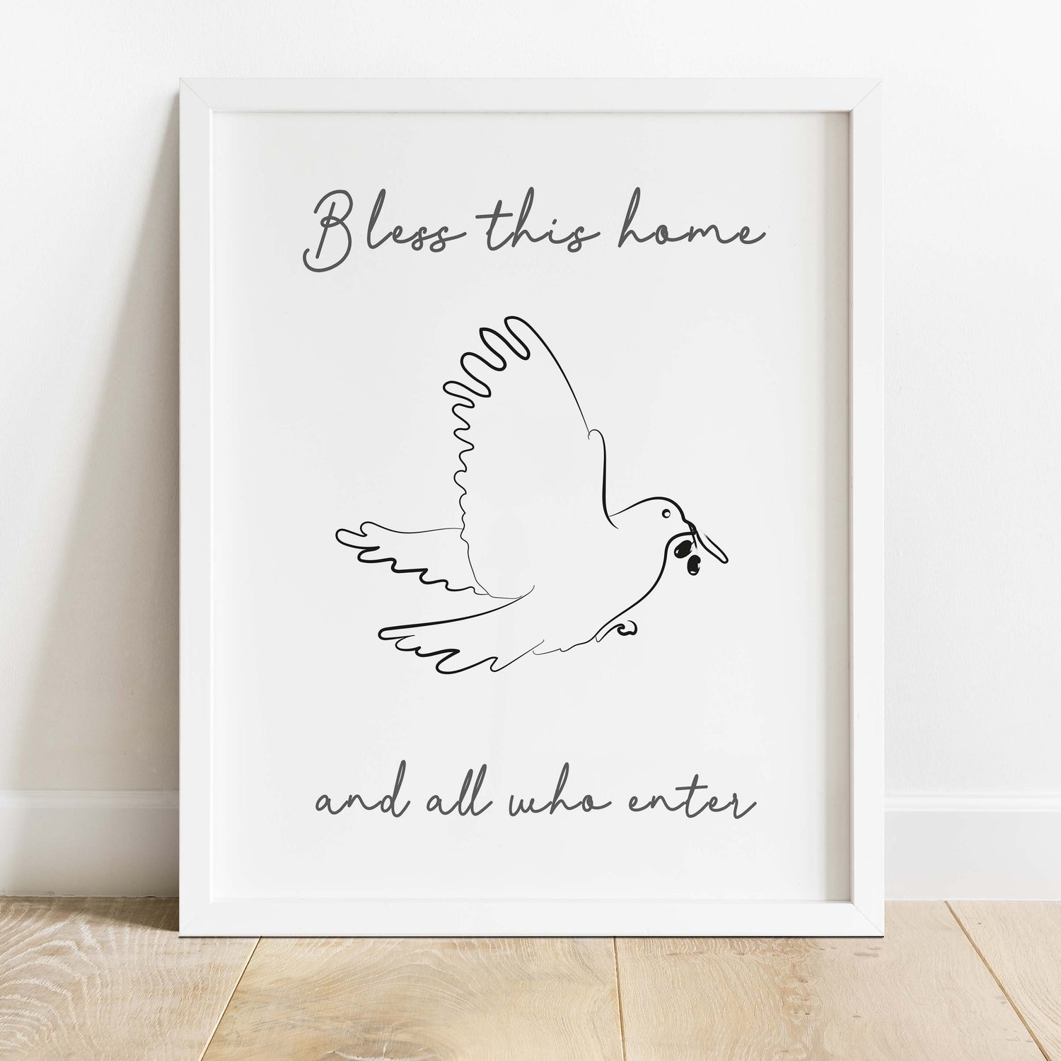 A5 Bless This Home Christian Wall Art Print - This A5 Christian wall art print is a beautifully simple yet meaningful piece, designed to bring a sense of peace and blessing into your home. Featuring delicate line art of a dove carrying an olive branch, the design symbolises hope, renewal and God’s gentle presence within our everyday spaces.